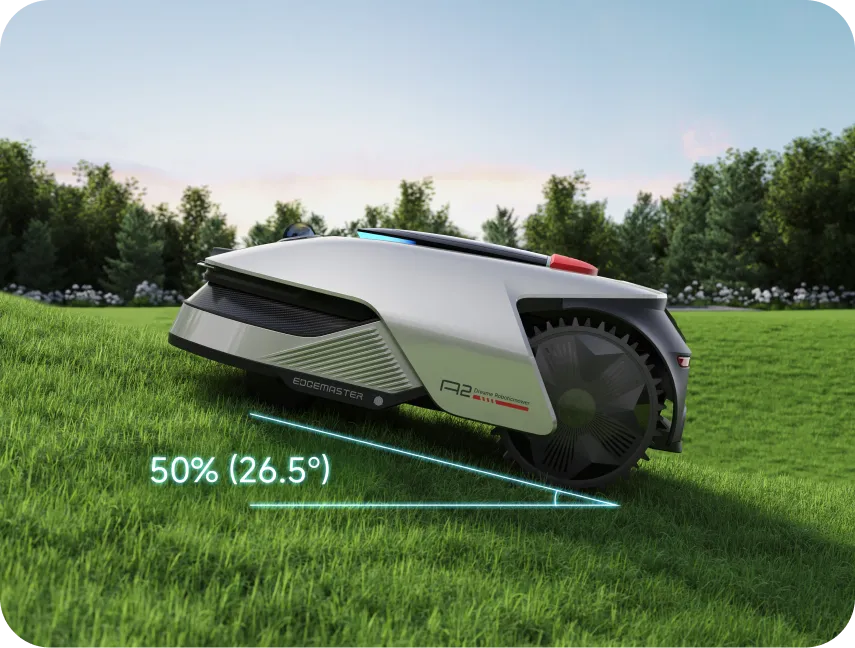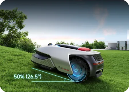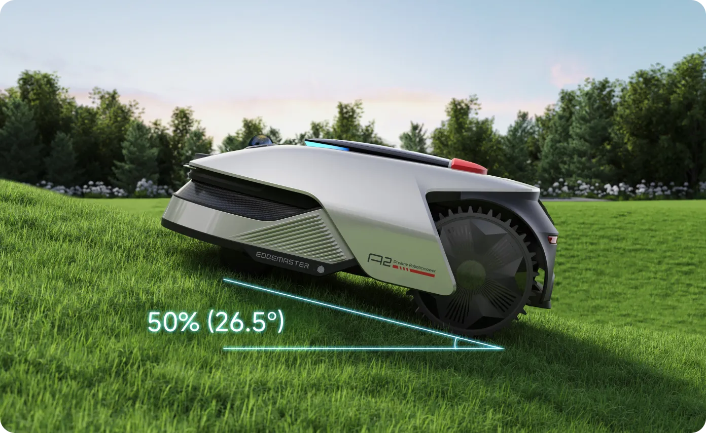 L'A2 a un moteur de moyeu qui augmente l'angle de pente maximum à 50 % (26,5°), pour une meilleure traction et une tonte plus stable et plus régulière sur les pentes.