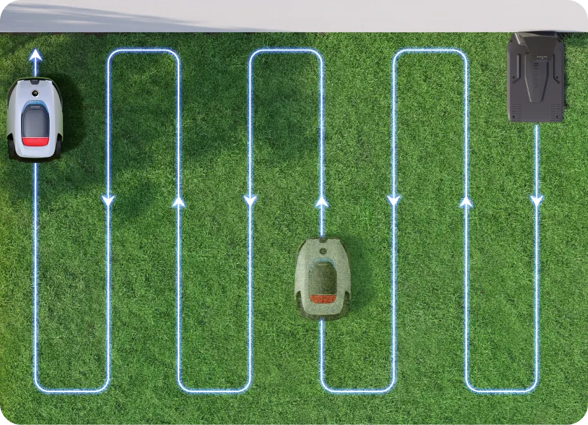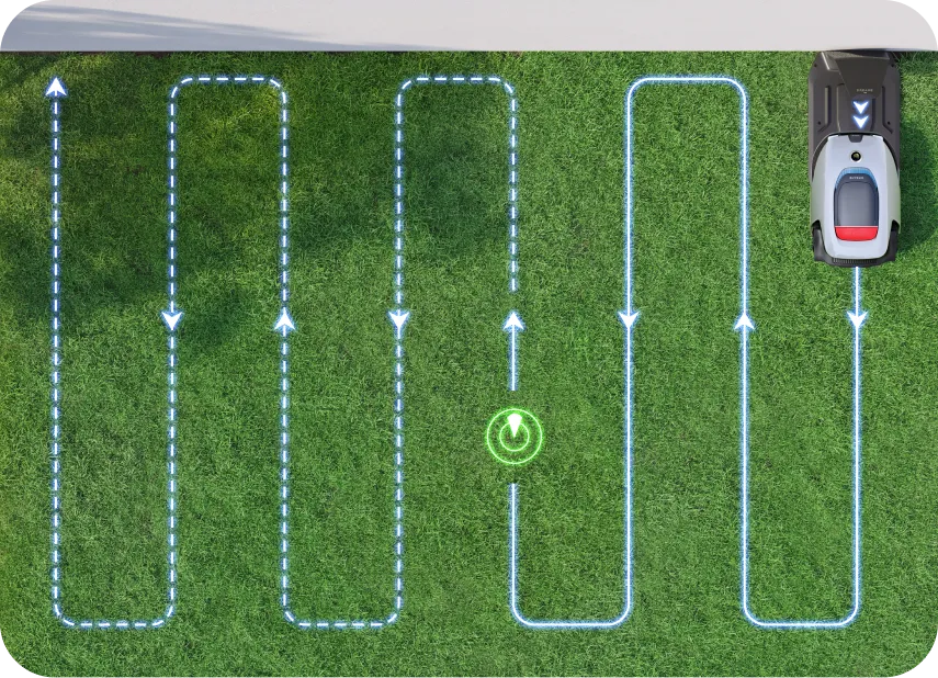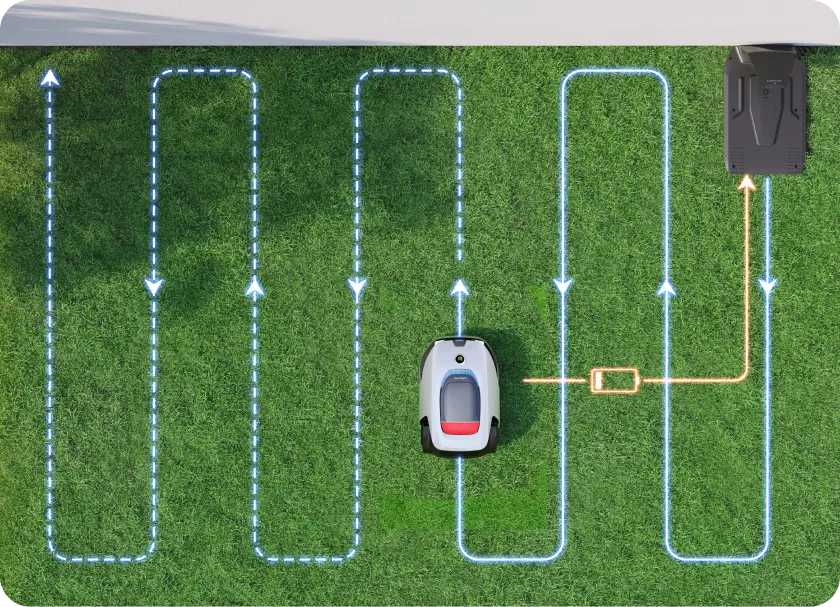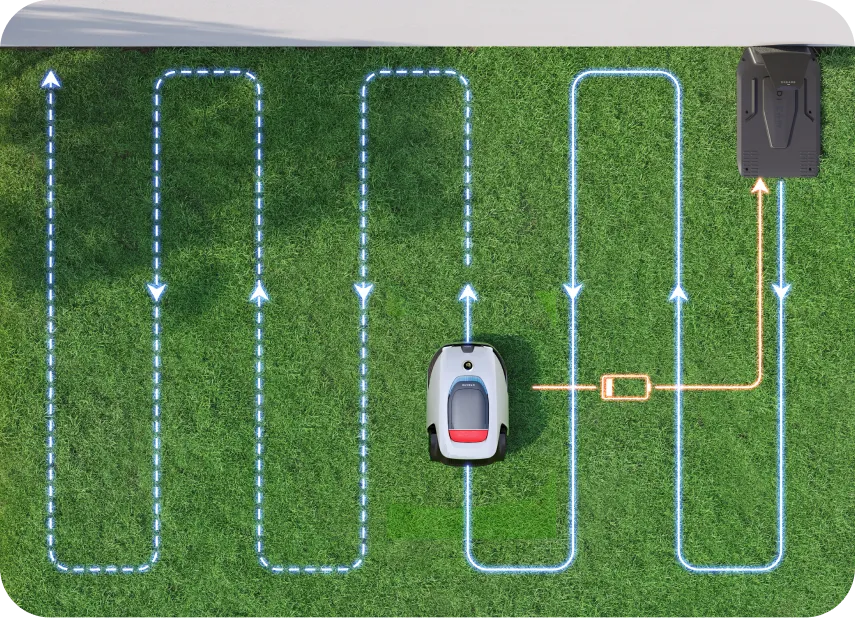 Bénéficiez d'un entretien ininterrompu de la pelouse avec l'A2. Lorsque la capacité de la batterie descend en dessous de 15 %, l'A2 retourne automatiquement à la station de recharge, puis reprend son fonctionnement après une charge complète.