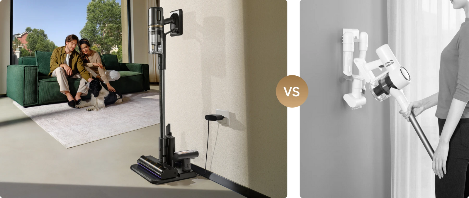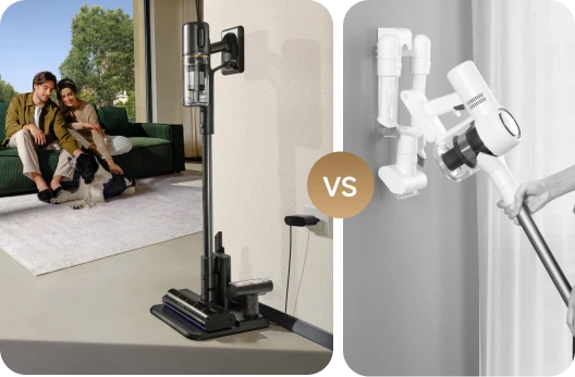 Le V20 se recharge lorsqu'il est rangé, ce qui garantit qu'il est toujours prêt à l'emploi. L'aspirateur et les accessoires sont rangés en toute sécurité sur la base pour un accès et une organisation faciles.