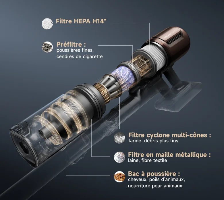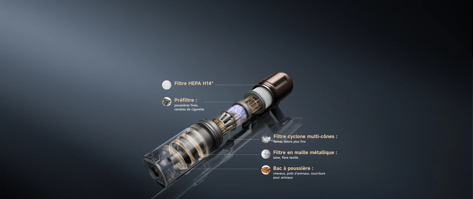 *Filtre HEPA H14 : le média filtrant atteint le niveau HEPA H14 conformément aux normes EN 1822-1:2019 et EN ISO 29463-3:2018, sur la base de tests effectués par Suzhou GTT Service Co., Ltd., rapport n° 0340-24A-01.