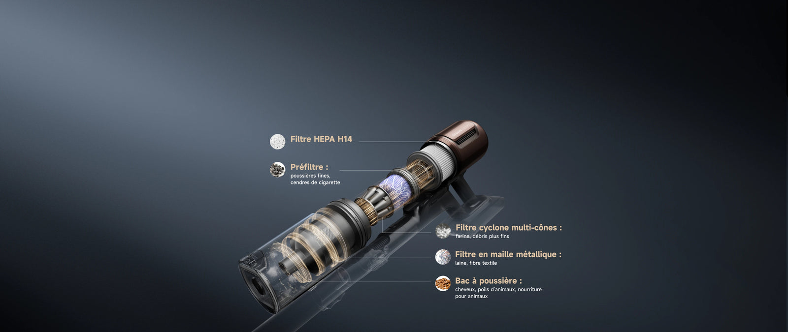 Le système de filtration à cinq couches, doté d’un filtre HEPA de grade H14*, capture les poussières fines et particules (y compris le pollen et les allergènes d’animaux) avec une efficacité allant jusqu’à 99,99 %*. Il aide à purifier l’air de votre maison.
