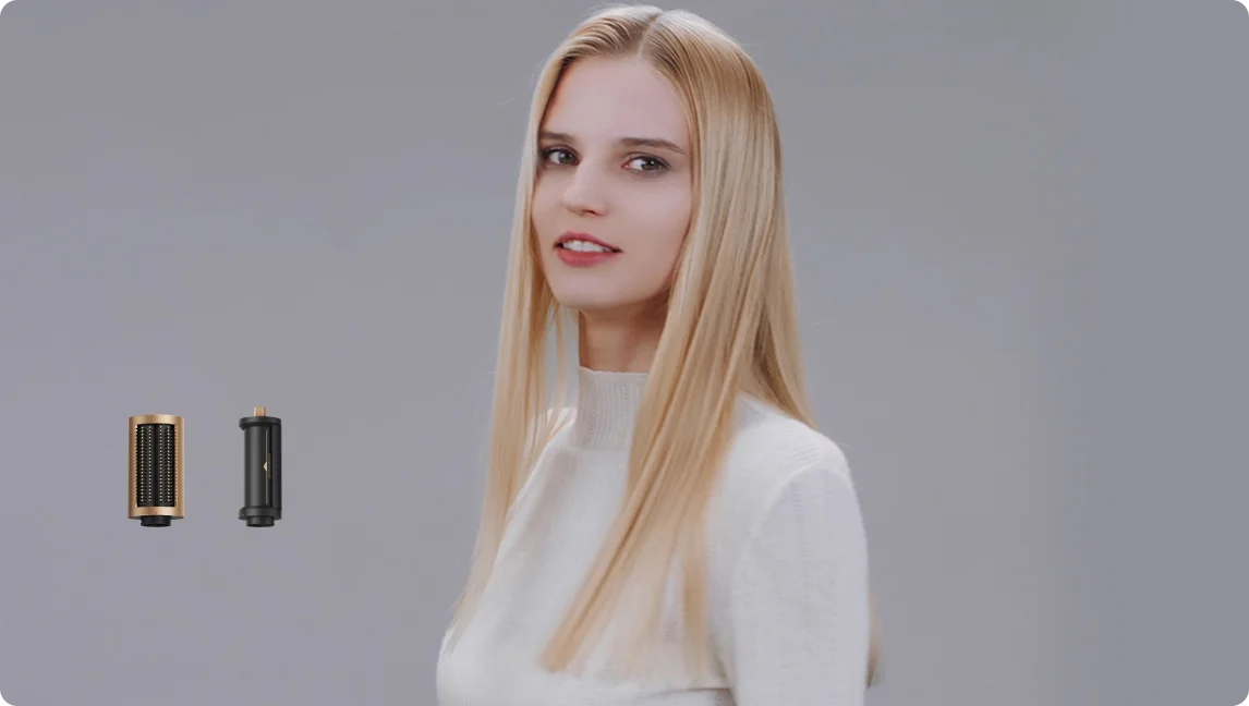 Placez le cylindre à côté de votre tête, tout en vous tenant face au miroir. Positionnez le symbole du triangle vers l’extérieur. Lorsque vous enroulez vos cheveux autour du cylindre, le symbole du triangle orienté vers l’extérieur vous guide pour créer une boucle naturelle vers l’extérieur.