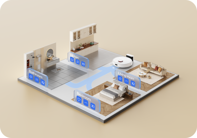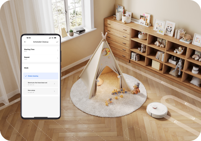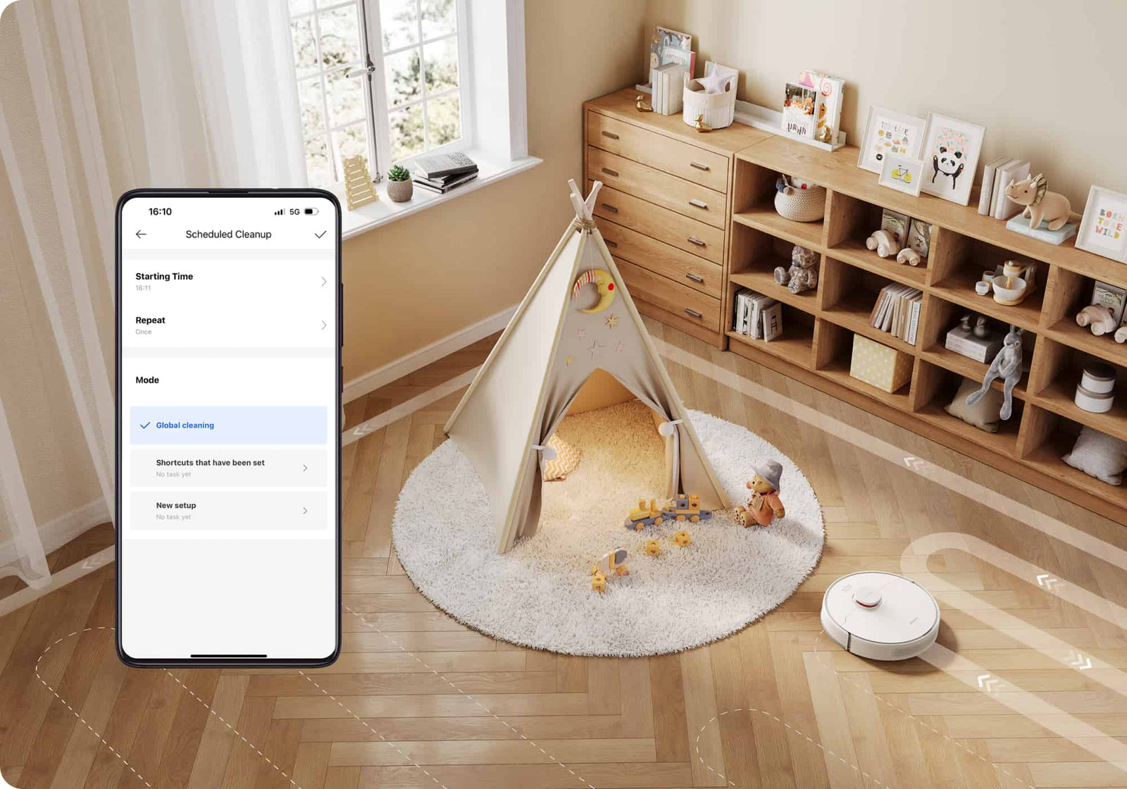 Segmentez les pièces, définissez des zones interdites, programmez des sessions de nettoyage et personnalisez votre mode de nettoyage, le schéma de nettoyage, la puissance d'aspiration, etc. via l'application.