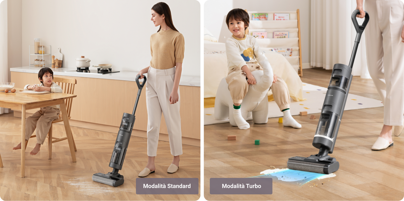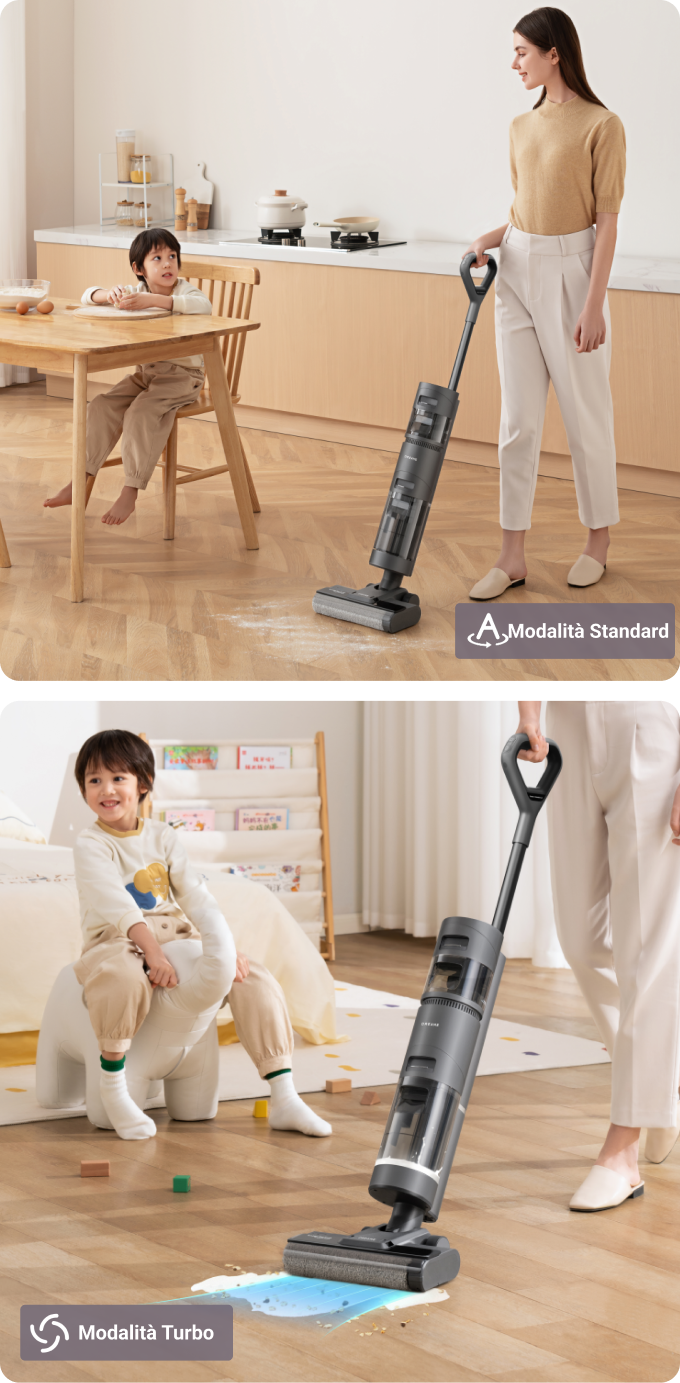 Deux modes sont proposés pour personnaliser vos besoins de nettoyage. Avec le mode Standard pour un nettoyage de base, le mode Turbo pour les saletés tenaces, les saletés sèches et humides peuvent être facilement traitées.