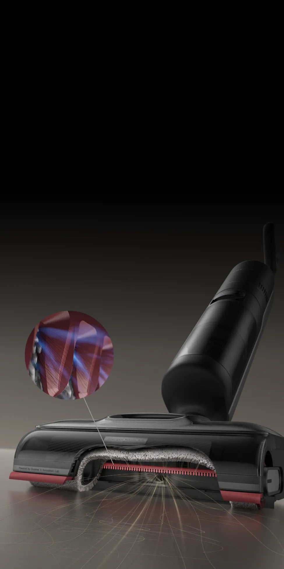 Le bras robotisé optimisé par l'IA anticipe chaque fois que vous poussez l'aspirateur vers l'avant et s'abaisse en seulement 0,2 seconde pour atteindre la saleté.