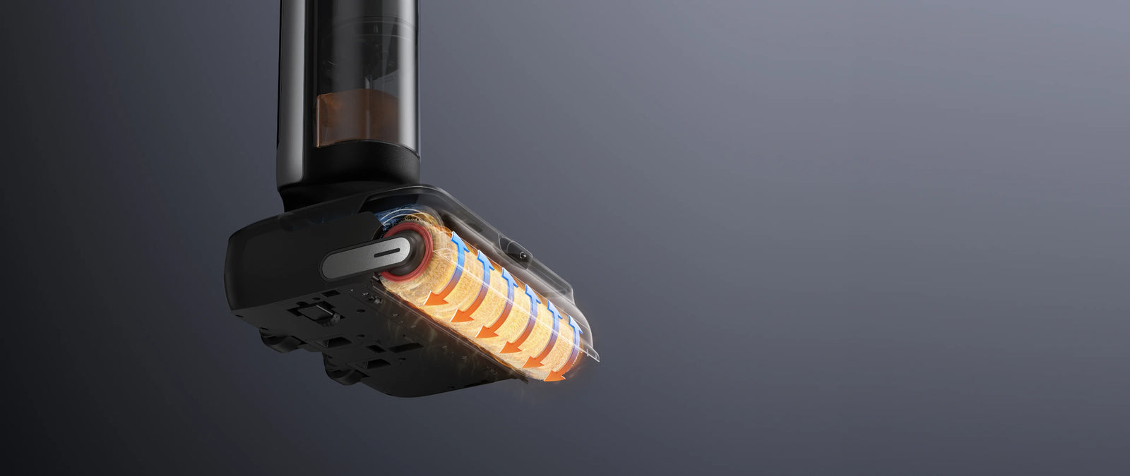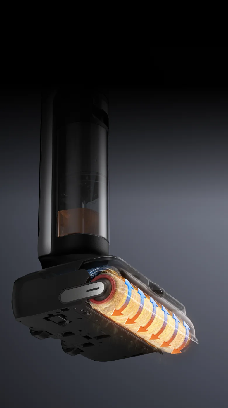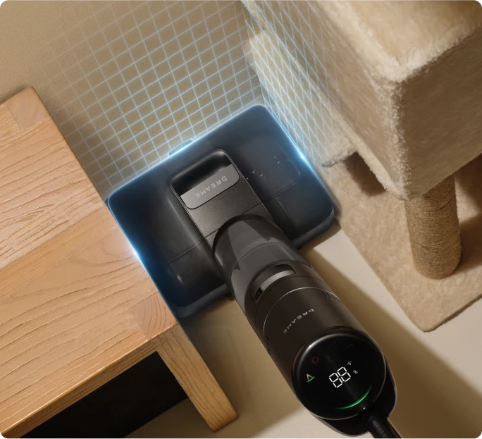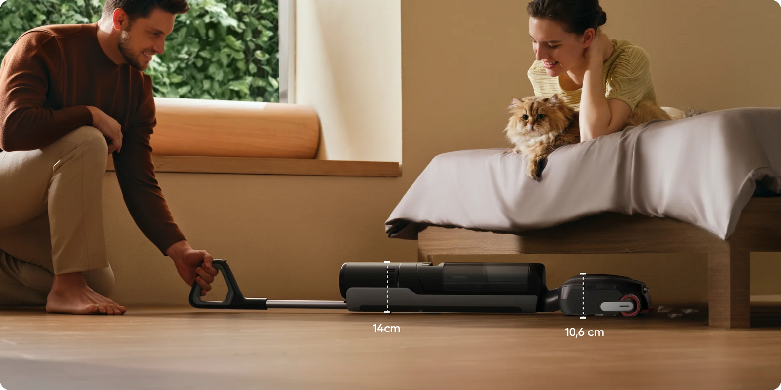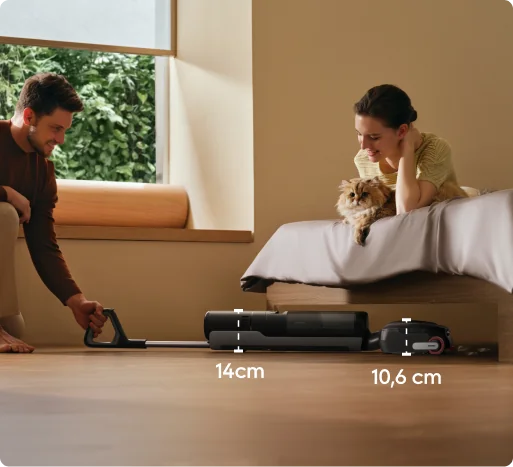 Le H15 Pro FoamWash s'incline complètement à 180°*, se glissant facilement sous les canapés et les meubles bas. Son réservoir d'eau sale retient l'eau en toute sécurité, protégeant ainsi le moteur tout en offrant une aspiration puissante allant jusqu'à 23 000 Pa pour venir à bout même des espaces les plus étroits.