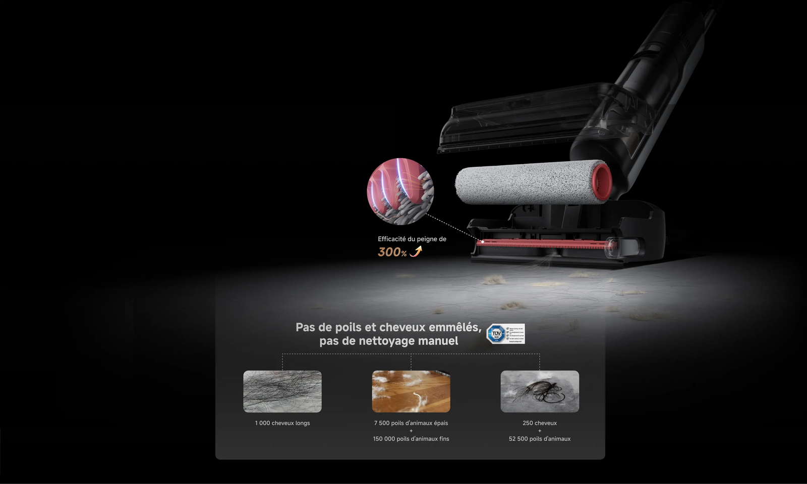 * 100 % sans nœud : le H15 Pro FoamWash nettoie environ 1 000 cheveux longs ; 7 500 poils d'animaux épais avec 150 000 poils d'animaux fins ; ou 250 cheveux avec 52 500 poils d'animaux sans aucun nœud. D'après les tests de TÜV SÜD (Chine) Shanghai Branch. Numéro de rapport : 704012501119-01. Les résultats réels peuvent varier.