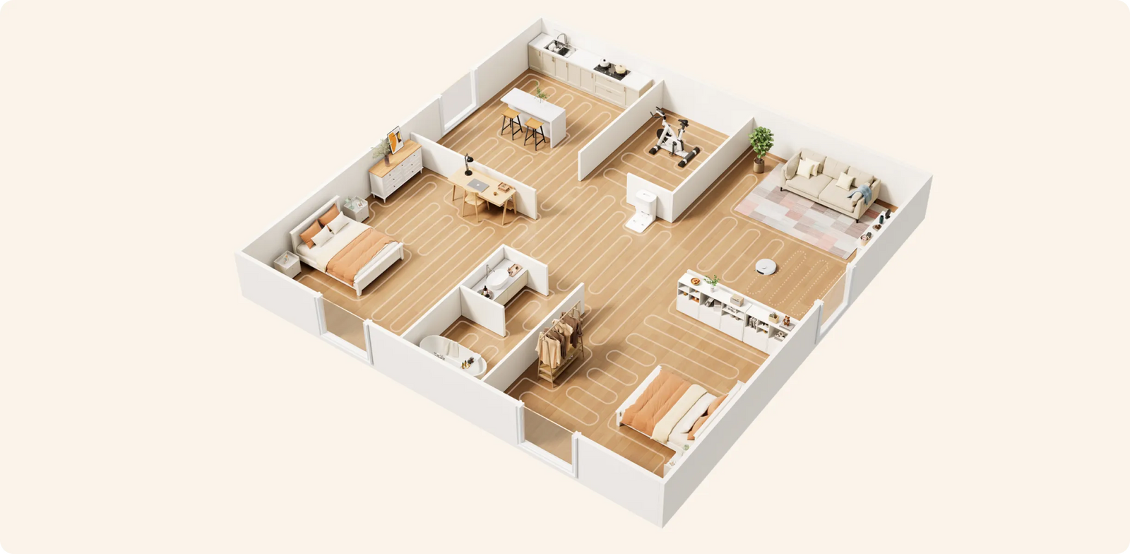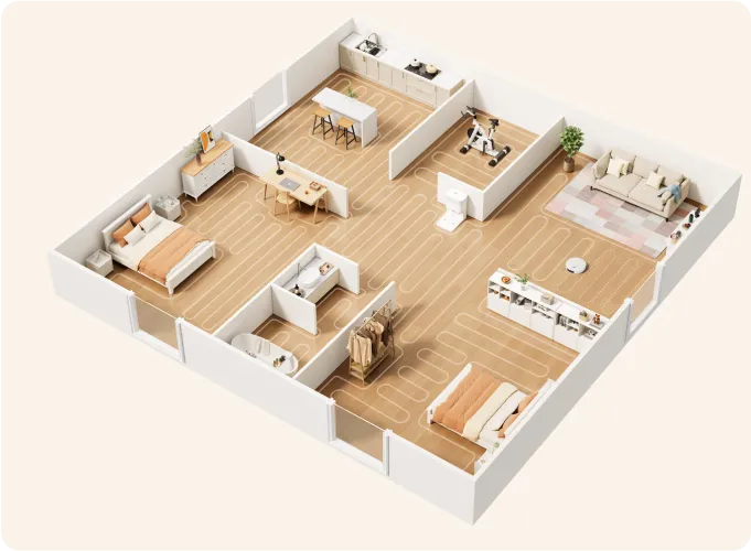 Gérez sans effort le nettoyage des intérieurs ayant plusieurs étages en créant jusqu'à quatre cartes distinctes et en personnalisant les schémas de nettoyage et la puissance d'aspiration pour chaque espace.