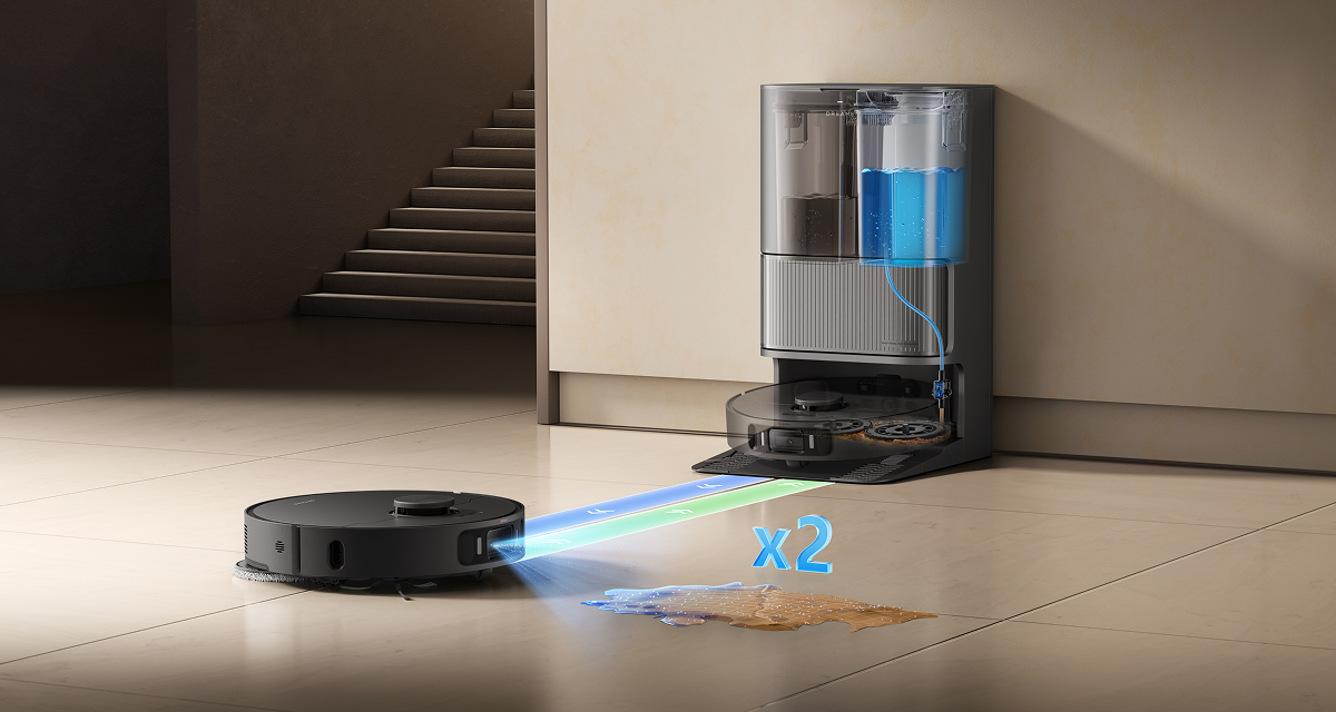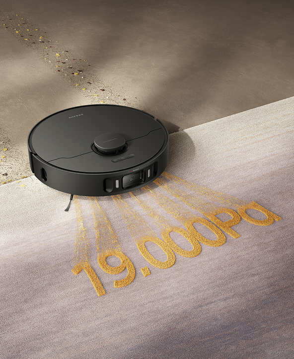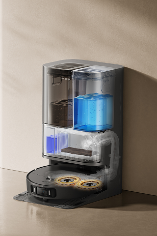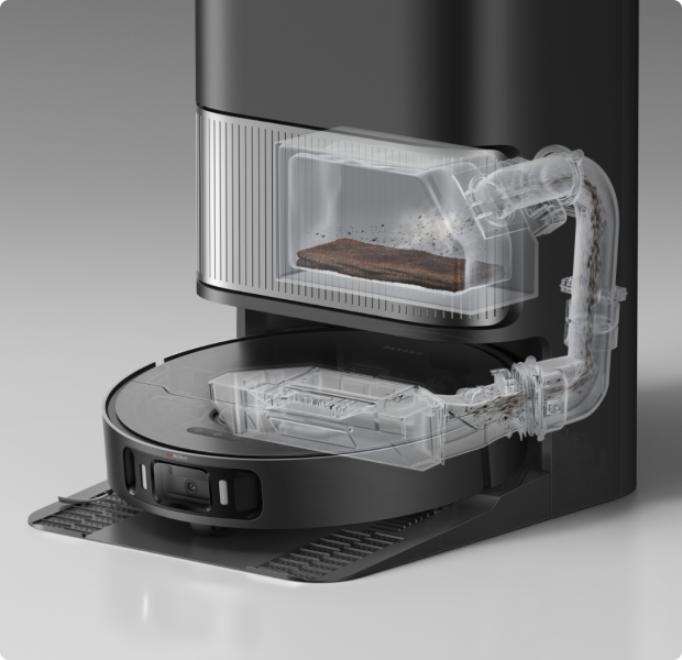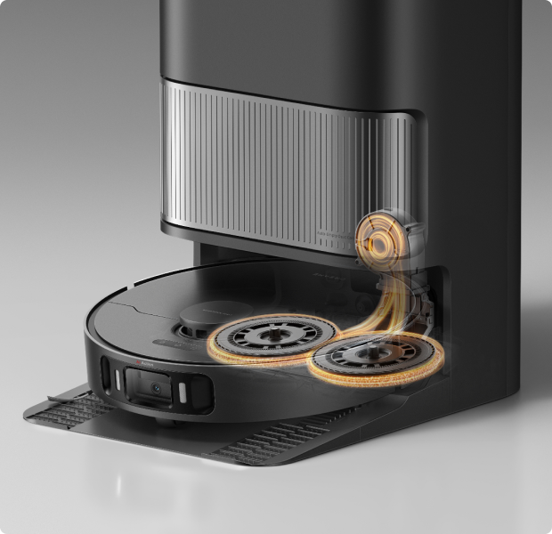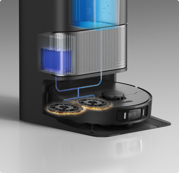 Profitez d'une mise à niveau polyvalente pour une maison plus propre. Grâce à une aspiration puissante de 19 000 Pa*, à une brosse principale en caoutchouc relevable et à une brosse TriCut, le robot aspirateur élimine les petites particules de poussière, les gros débris des tapis/moquettes et des sols et réduit la formation de nœuds. Grâce au lavage automatique des serpillières avec de l'eau chaude à 75 °C* et à la plaque de lavage avec nettoyage automatique avancée, l'entretien post-lavage est grandement facilité.