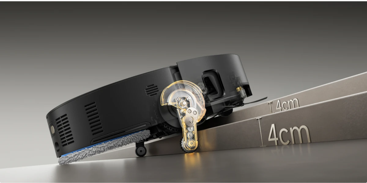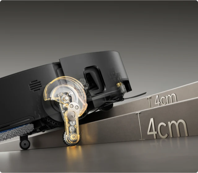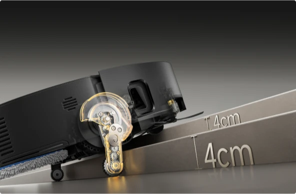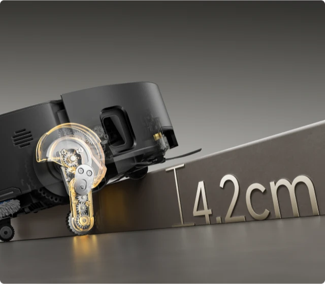 * 8 cm, 4 cm : correspond à la hauteur d'une marche à deux niveaux où la surface supérieure de la marche du bas fait plus de 12 cm de large, lorsque le robot aspirateur utilise ses pieds rétractables en mode Franchissement d'obstacles de type haie. Pour une marche à un seul niveau, la hauteur la plus élevée est de 4,2 cm. Sur la base des données de notre laboratoire interne. Les performances réelles peuvent varier.