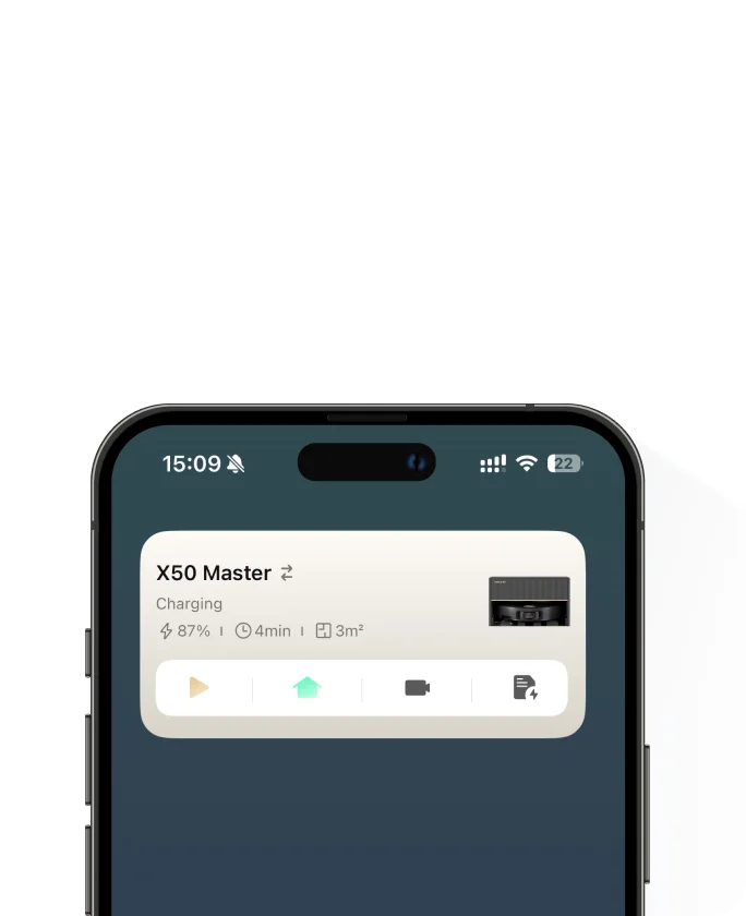 La batterie de 6 400 mAh du X50 Master offre jusqu'à 220 minutes* de nettoyage en mode Silencieux, sur une surface pouvant atteindre 205 m²* en une seule charge. Lorsque la batterie est faible, l'appareil retourne à la base pour se recharger, puis reprend le nettoyage là où il s'était arrêté. Bénéficiez d'un temps de recharge réduit de 30 %*, ainsi que de la possibilité de recharger pendant les heures creuses.