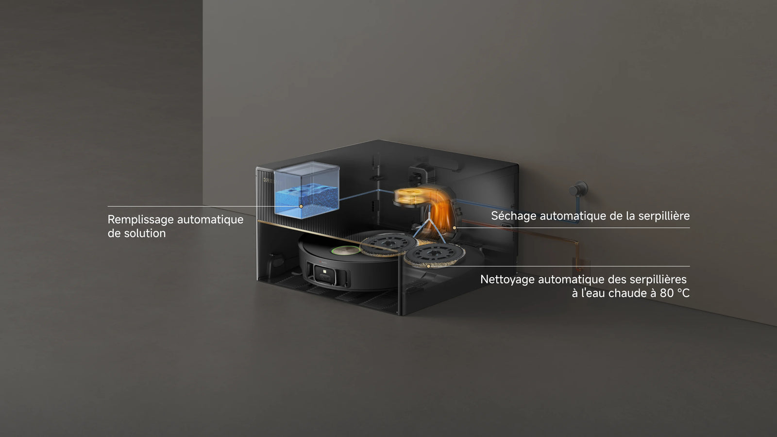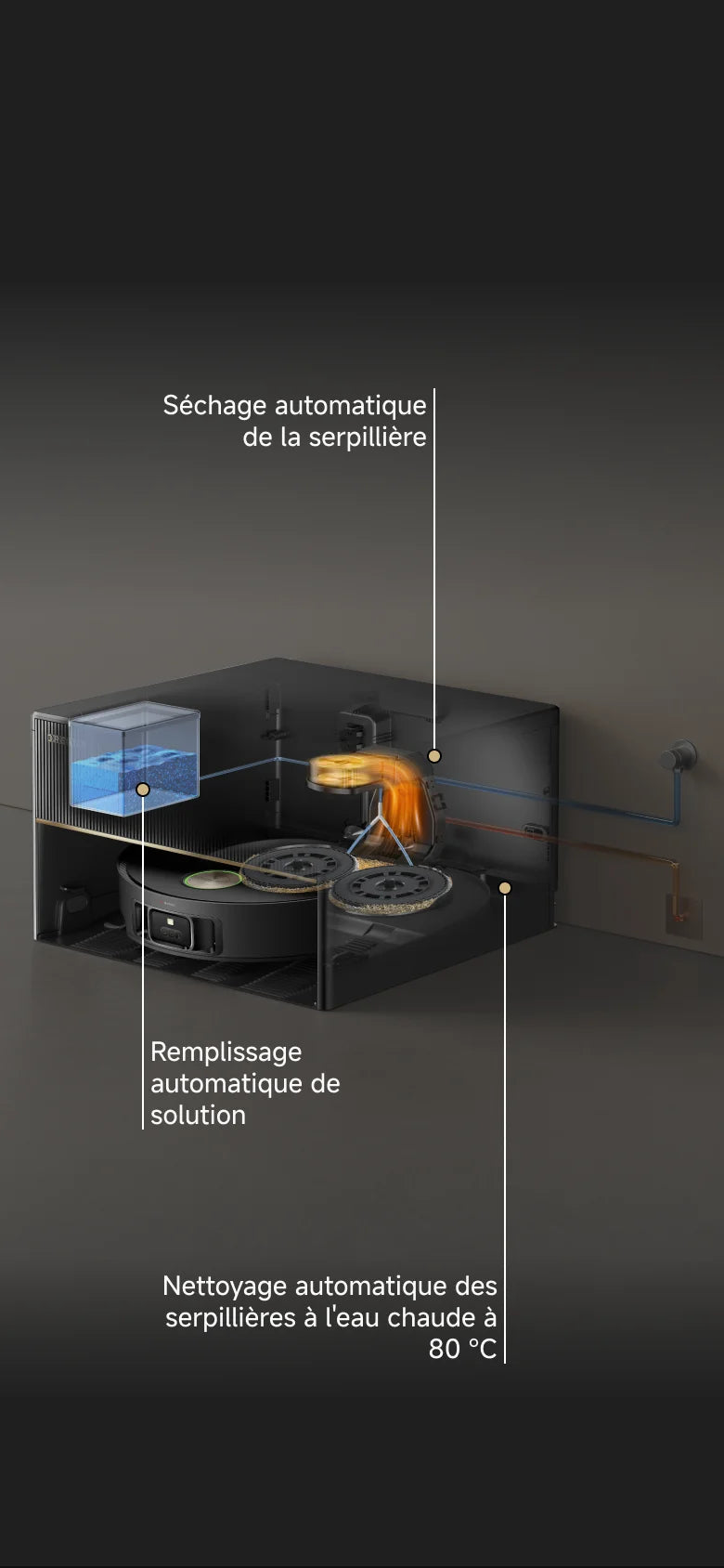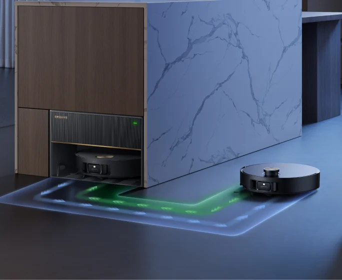 Dites adieu aux charges lourdes et aux tâches manuelles ! Profitez d'environ 100 jours d'aspiration autonome*, de serpillières autonettoyantes à l'eau chaude, du remplissage automatique et de systèmes de séchage. Ensemble, ces fonctionnalités simplifient le nettoyage, réduisent l'entretien et préservent la fraîcheur de votre maison, sans effort.