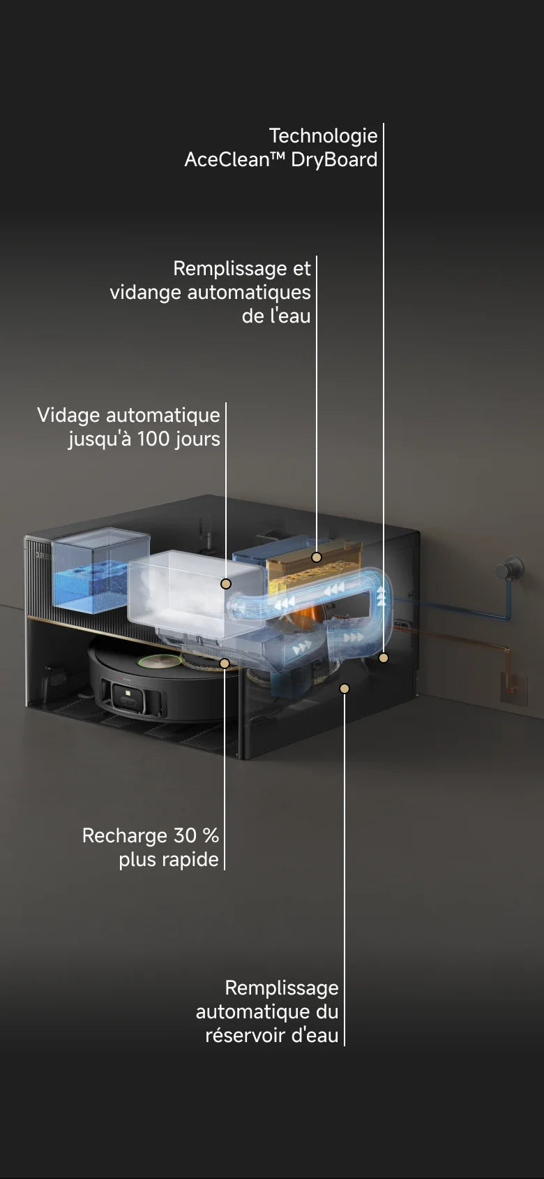 *Système de remplissage et de vidange automatique : fourni avec l'aspirateur robot. Nécessite une installation séparée.