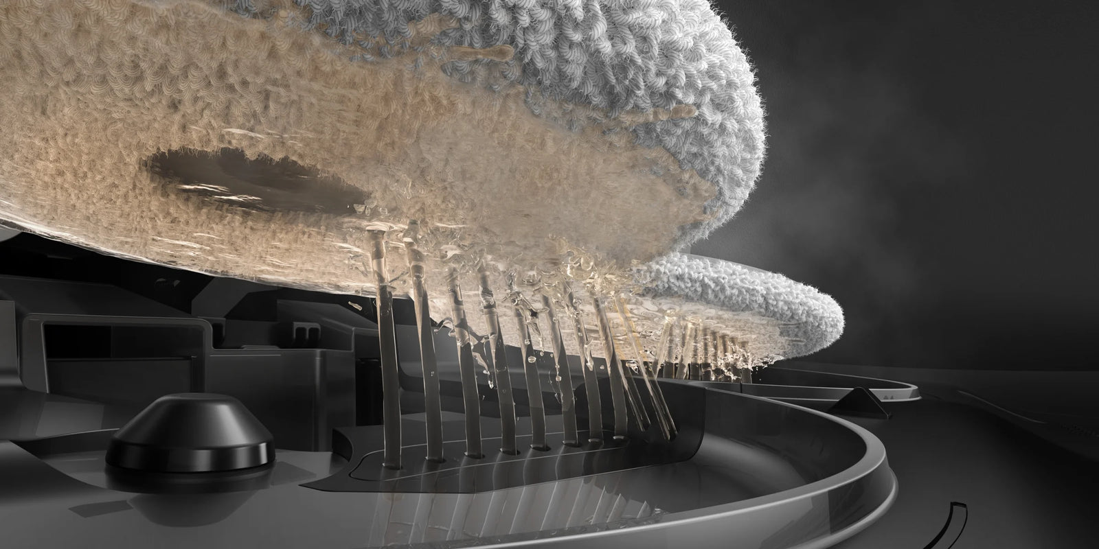 Pendant le lavage, la technologie TripleUp Tech soulève les brosses latérales et principales jusqu'à 10 mm*, ce qui permet aux serpillères de s'abaisser et de s'attaquer aux taches tenaces comme la sauce soja et le café. Cela permet de garder les brosses au sec et d'éviter les mauvaises odeurs dans le bac à poussière, pour un fonctionnement optimal de votre aspirateur et une sensation de fraîcheur.