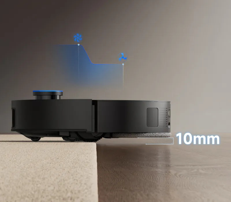 *10,5 mm : sur la base des tests effectués dans notre laboratoire interne. La différence de hauteur du robot aspirateur est de 10,5 mm avant et après le levage des serpillières.