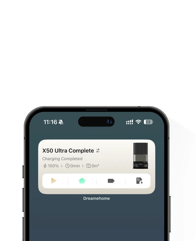 La batterie de 6 400 mAh du X50 Ultra Complete offre jusqu'à 220 minutes* de nettoyage en mode silencieux, sur une surface pouvant atteindre 205 m² en une seule charge*. Lorsque la batterie est faible, l'appareil retourne à la base pour se recharger, puis reprend le nettoyage là où il s'était arrêté. Bénéficiez d'un temps de recharge réduit de 30 %*, ainsi que de la possibilité de recharger pendant les heures creuses.
