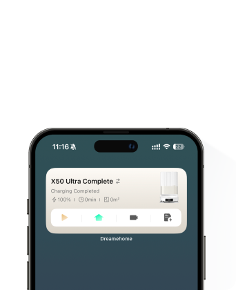 La batterie de 6 400 mAh du X50 Ultra Complete offre jusqu'à 220 minutes* de nettoyage en mode silencieux, sur une surface pouvant atteindre 205 m² en une seule charge*. Lorsque la batterie est faible, l'appareil retourne à la base pour se recharger, puis reprend le nettoyage là où il s'était arrêté. Bénéficiez d'un temps de recharge réduit de 30 %*, ainsi que de la possibilité de recharger pendant les heures creuses.