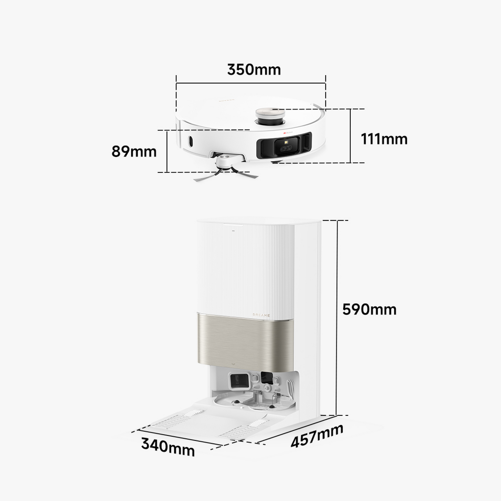 * 89 mm : Après avoir démarré le système de navigation VersaLift, le robot aspirateur nettoie sous les meubles presque au même niveau que le corps du robot, ce qui peut le rayer. Assurez-vous que le fond et les bords du meuble sont plats et sans protubérances avant de lancer la navigation.