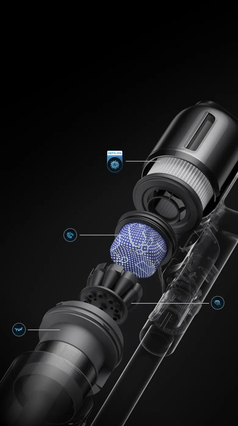 * 200 m² : sur la base des tests effectués dans le laboratoire Dreame, en mode éco avec la brosse principale. Les performances réelles peuvent varier en fonction de l'agencement de votre maison.