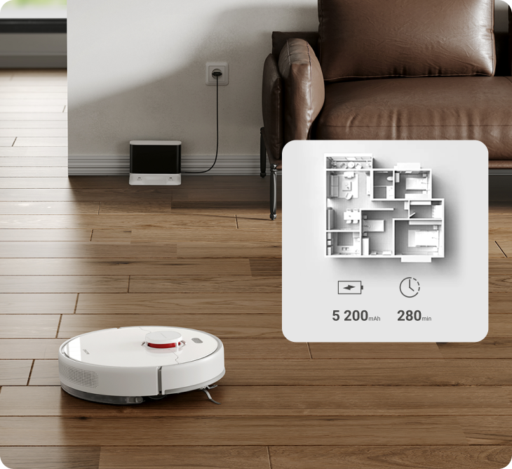 Profitez d'un nettoyage d'un coin à l'autre de votre maison grâce à une batterie de 5 200 mAh qui offre jusqu'à 280 min* de nettoyage continu. Lorsque la batterie est faible, votre robot retourne automatiquement à la station de charge, puis reprend le nettoyage à l'endroit où il s'est arrêté pour s'assurer que toute votre maison est nettoyée.