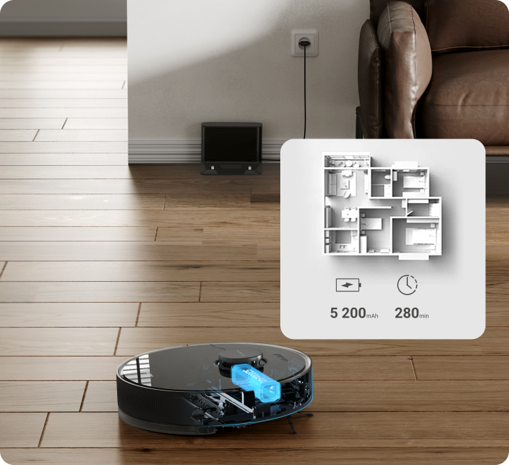 Profitez d'un nettoyage d'un coin à l'autre de votre maison grâce à une batterie de 5 200 mAh qui offre jusqu'à 280 min* de nettoyage continu. Lorsque la batterie est faible, votre robot retourne automatiquement à la station de charge, puis reprend le nettoyage à l'endroit où il s'est arrêté pour s'assurer que toute votre maison est nettoyée.