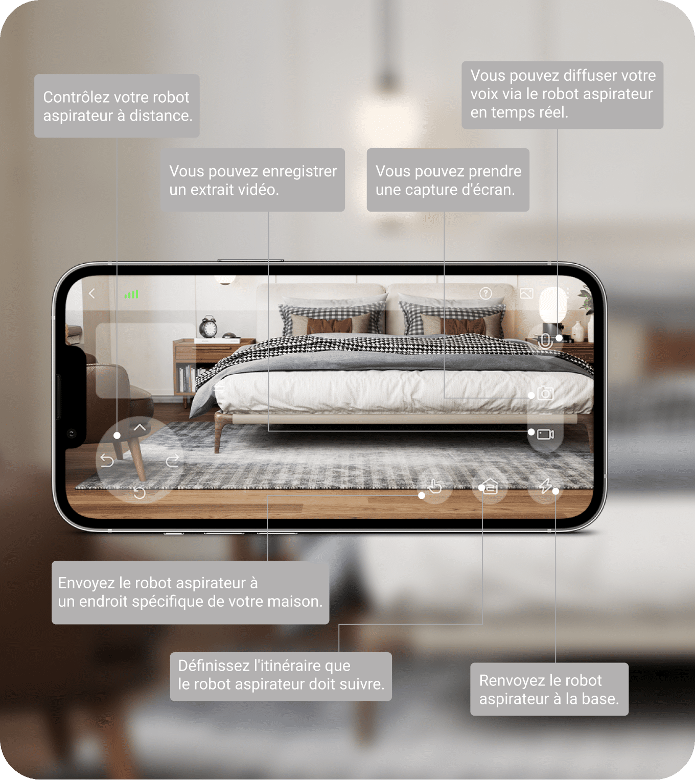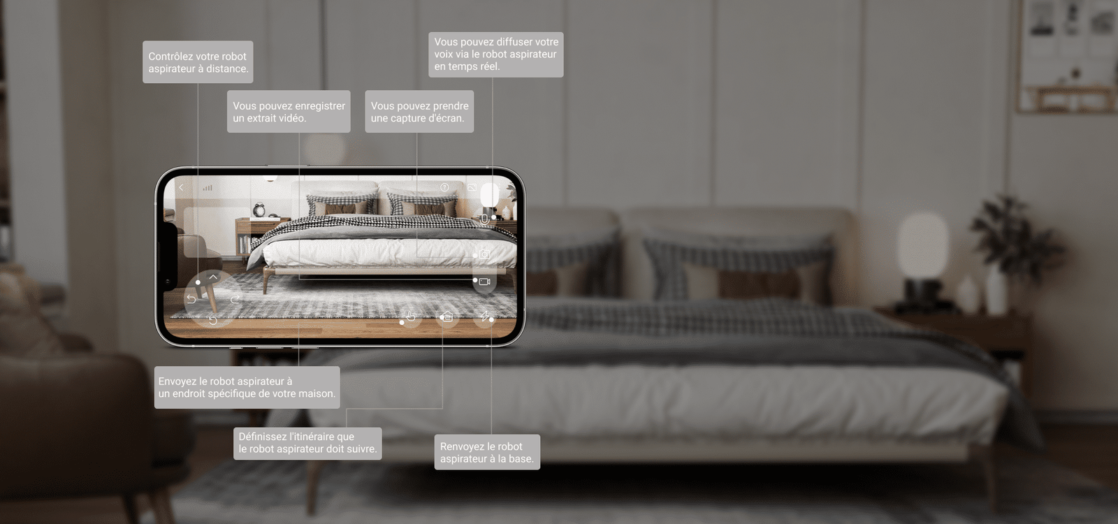 La surveillance vidéo à distance* vous permet de surveiller votre maison, vos animaux de compagnie et vos enfants, où que vous soyez. Grâce au robot, obtenez une vue d'ensemble de votre maison pour la découvrir sous une toute nouvelle perspective, ou vérifiez les espaces sous les meubles en quelques clics sur votre téléphone.