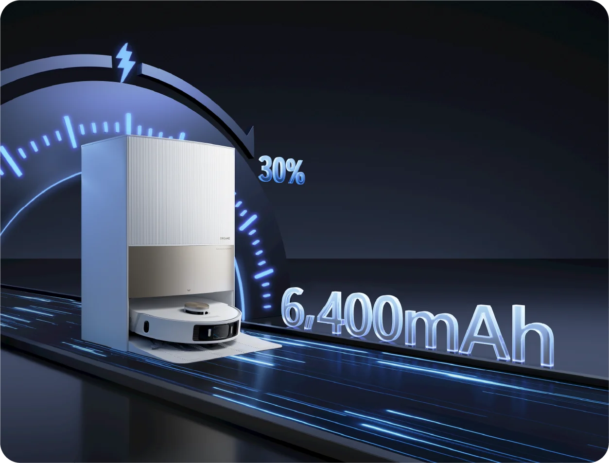 La technologie avancée de Dreame augmente considérablement la vitesse de recharge pour l'importante batterie de 6 400 mAh, afin de garantir que votre robot est prêt rapidement pour la prochaine séance de nettoyage.