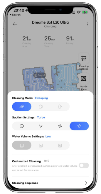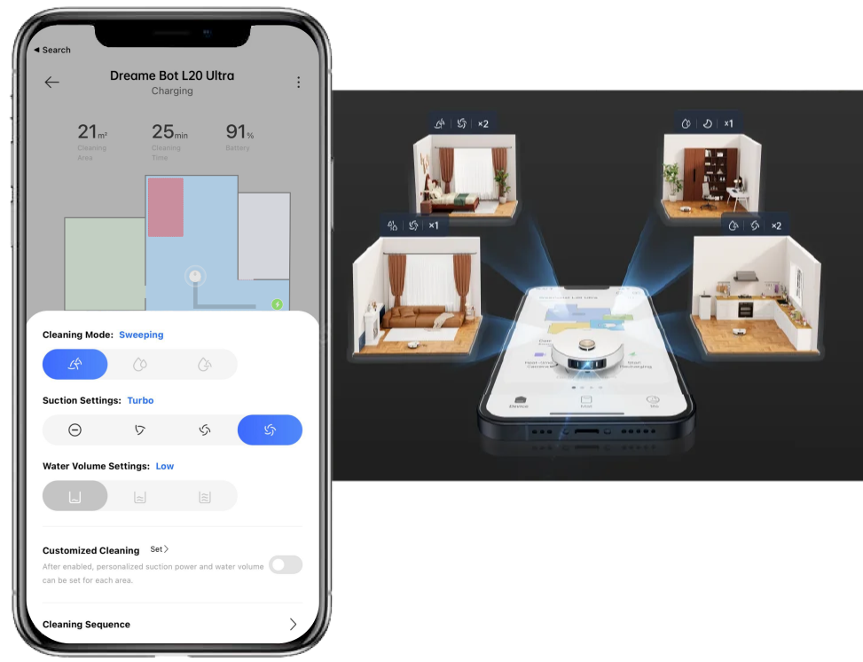 Téléchargez la nouvelle application depuis l'App Store ou Google Play pour profiter de la meilleure expérience Dreamehome.L'application vous permet de contrôler le robot et de personnaliser votre nettoyage en fonction de votre maison et de votre emploi du temps.Segmentez les pièces, créez des murs virtuels, définissez des zones interdites ou programmez des nettoyages, le tout depuis votre téléphone.