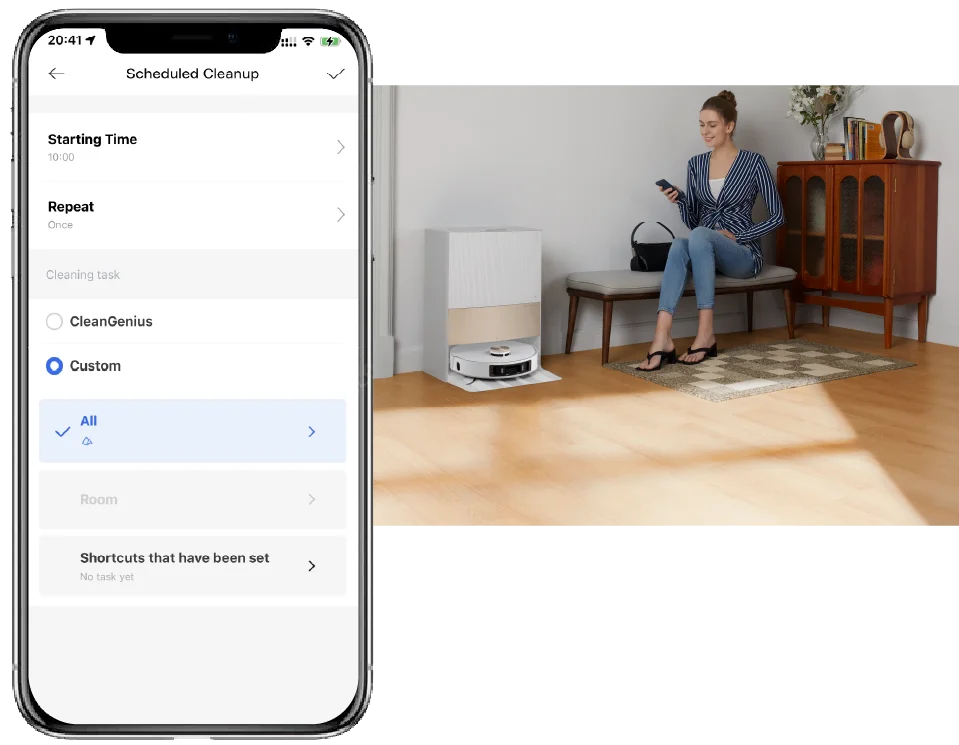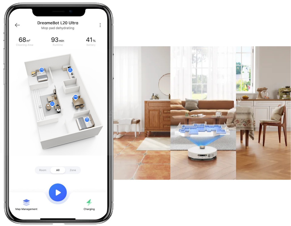 Téléchargez la nouvelle application depuis l'App Store ou Google Play pour profiter de la meilleure expérience Dreamehome.L'application vous permet de contrôler le robot et de personnaliser votre nettoyage en fonction de votre maison et de votre emploi du temps.Segmentez les pièces, créez des murs virtuels, définissez des zones interdites ou programmez des nettoyages, le tout depuis votre téléphone.