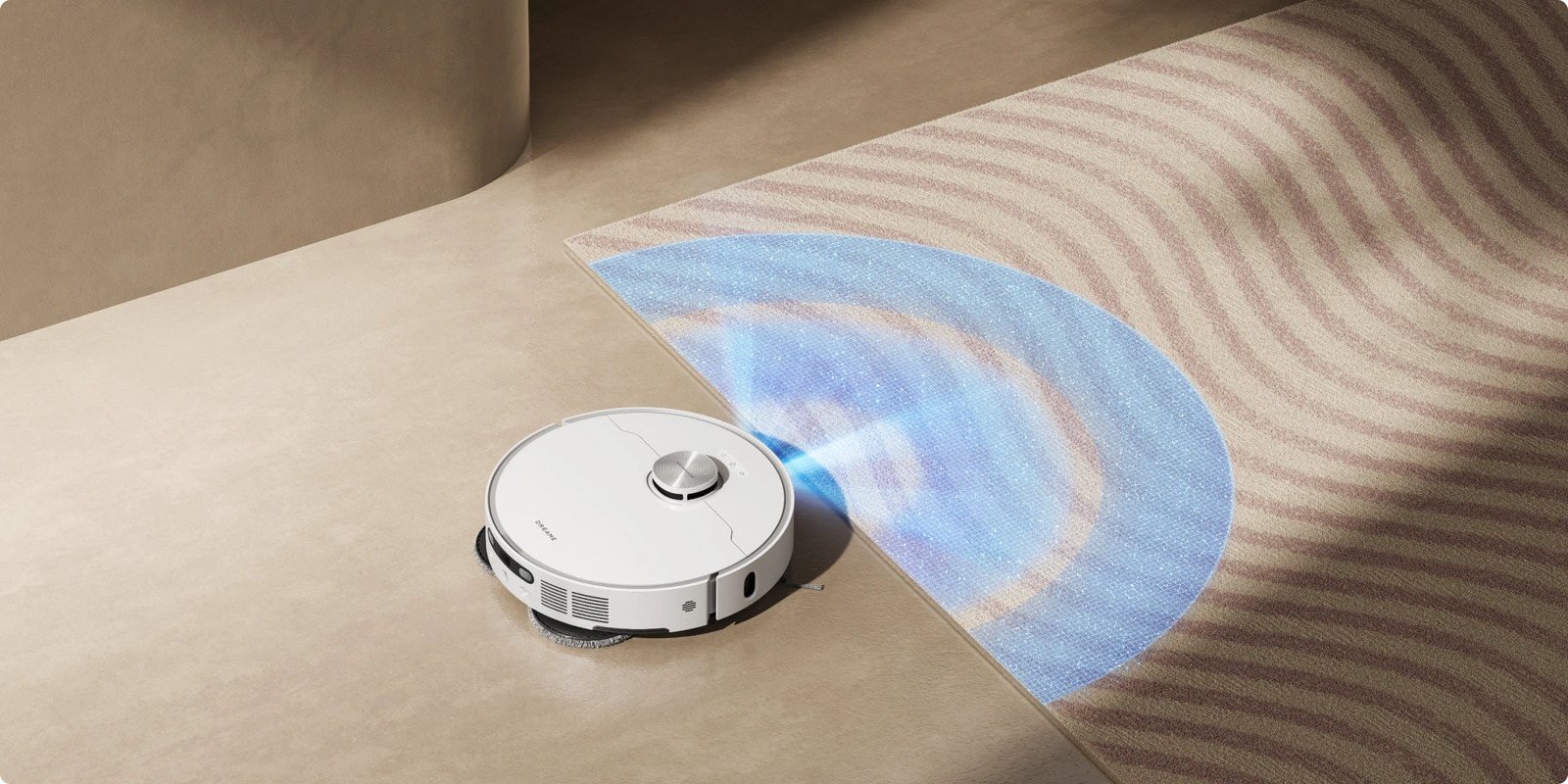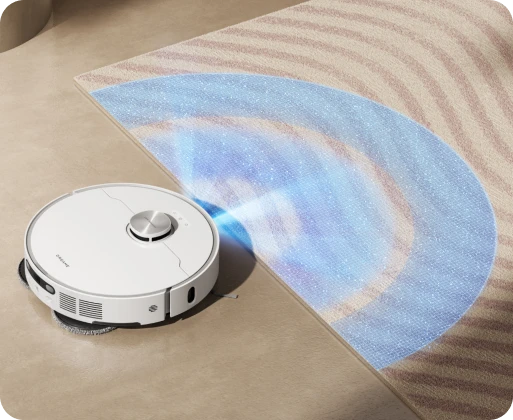 Le L40 Ultra AE est équipé d'une fonction de reconnaissance à ultrasons des tapis et moquettes. Il est capable de détecter automatiquement les tapis/moquettes, les nettoyer ou les éviter en fonction des réglages effectués dans l'application Dreamehome.
