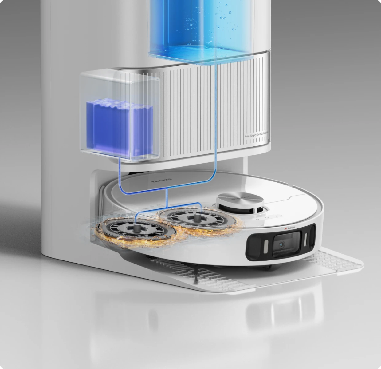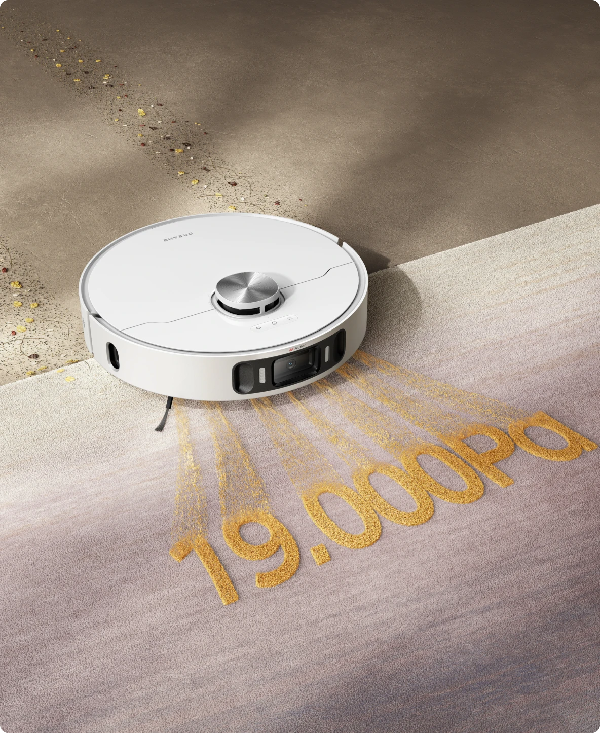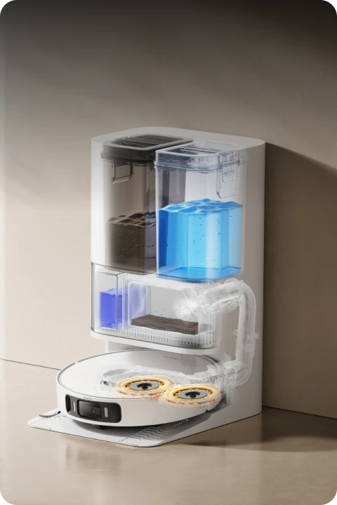 Profitez d'une mise à niveau polyvalente pour une maison plus propre. Grâce à une aspiration puissante de 19 000 Pa*, à une brosse principale en caoutchouc relevable et à une brosse TriCut, le robot aspirateur élimine les petites particules de poussière, les gros débris des tapis/moquettes et des sols et réduit la formation de nœuds. Grâce au lavage automatique des serpillières avec de l'eau chaude à 75 °C* et à la plaque de lavage avec nettoyage automatique avancée, l'entretien post-lavage est grandement facilité.
