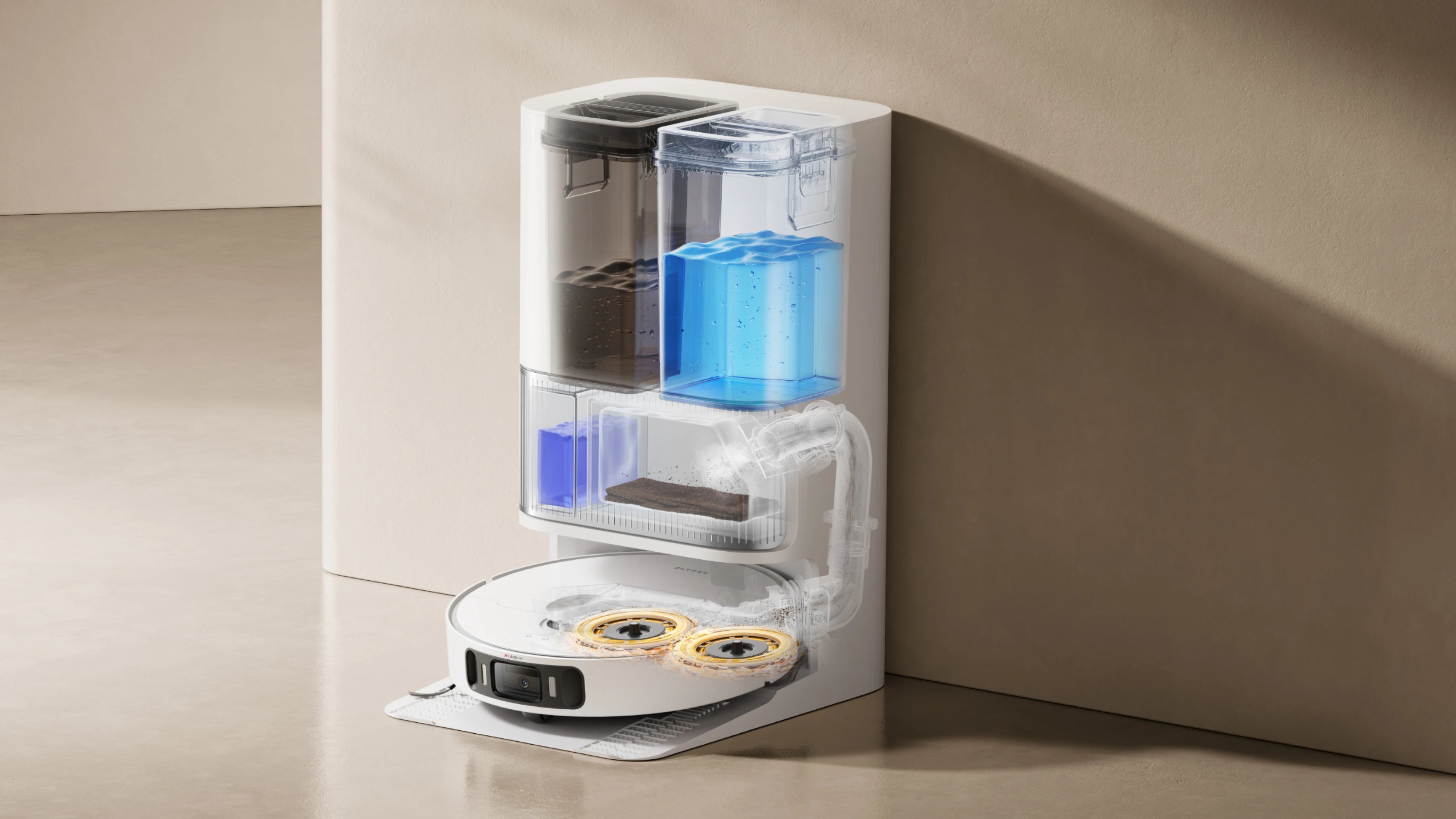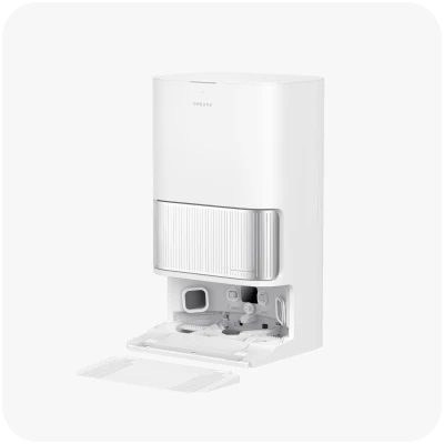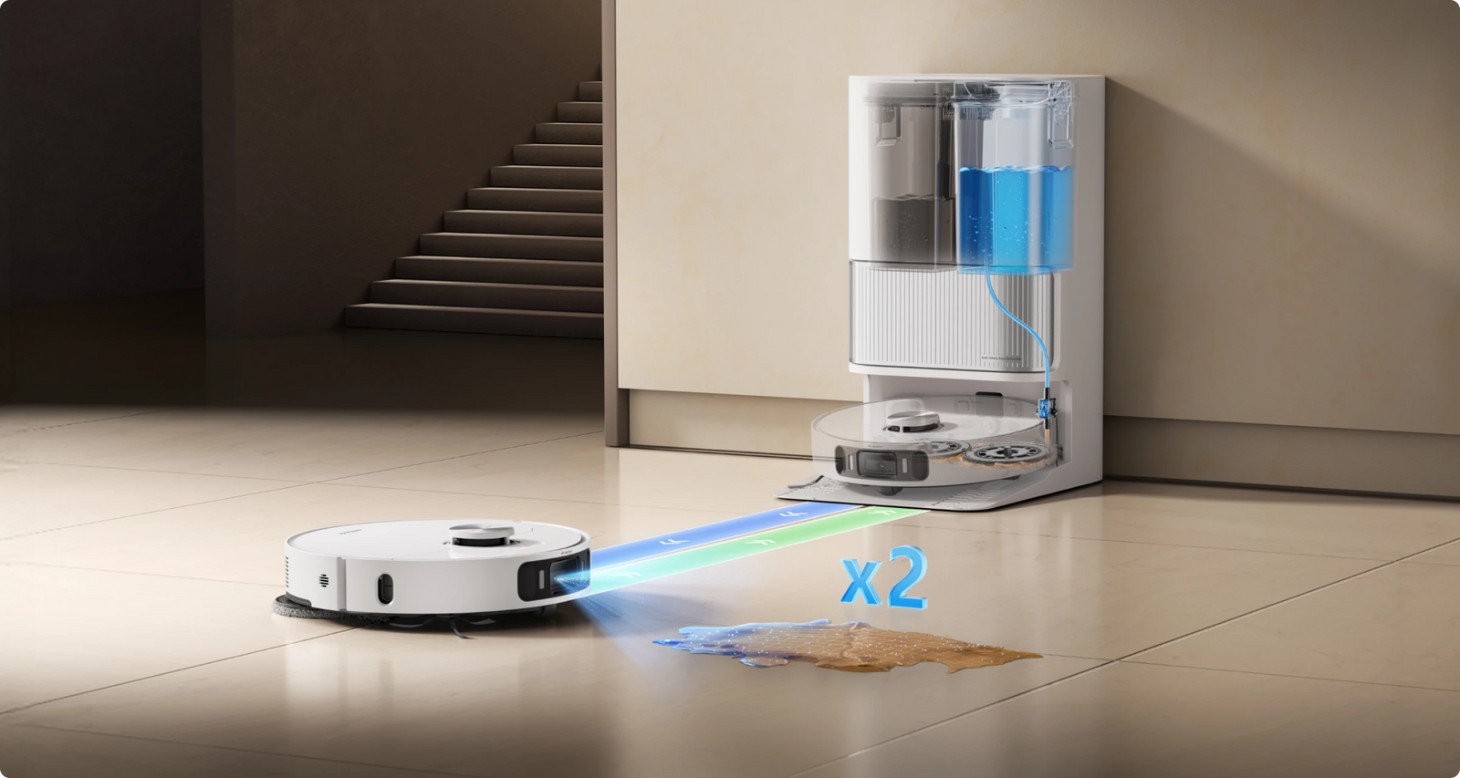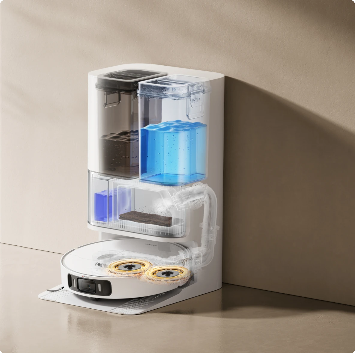 Profitez d'une mise à niveau polyvalente pour une maison plus propre. Grâce à une aspiration puissante de 19 000 Pa*, à une brosse principale en caoutchouc relevable et à une brosse TriCut, le robot aspirateur élimine les petites particules de poussière, les gros débris des tapis/moquettes et des sols et réduit la formation de nœuds. Grâce au lavage automatique des serpillières avec de l'eau chaude à 75 °C* et à la plaque de lavage avec nettoyage automatique avancée, l'entretien post-lavage est grandement facilité.