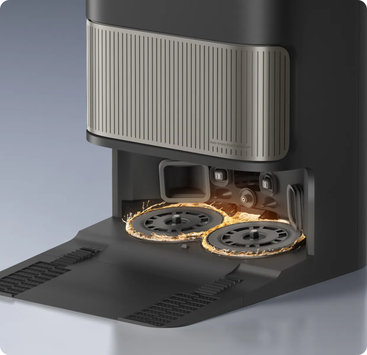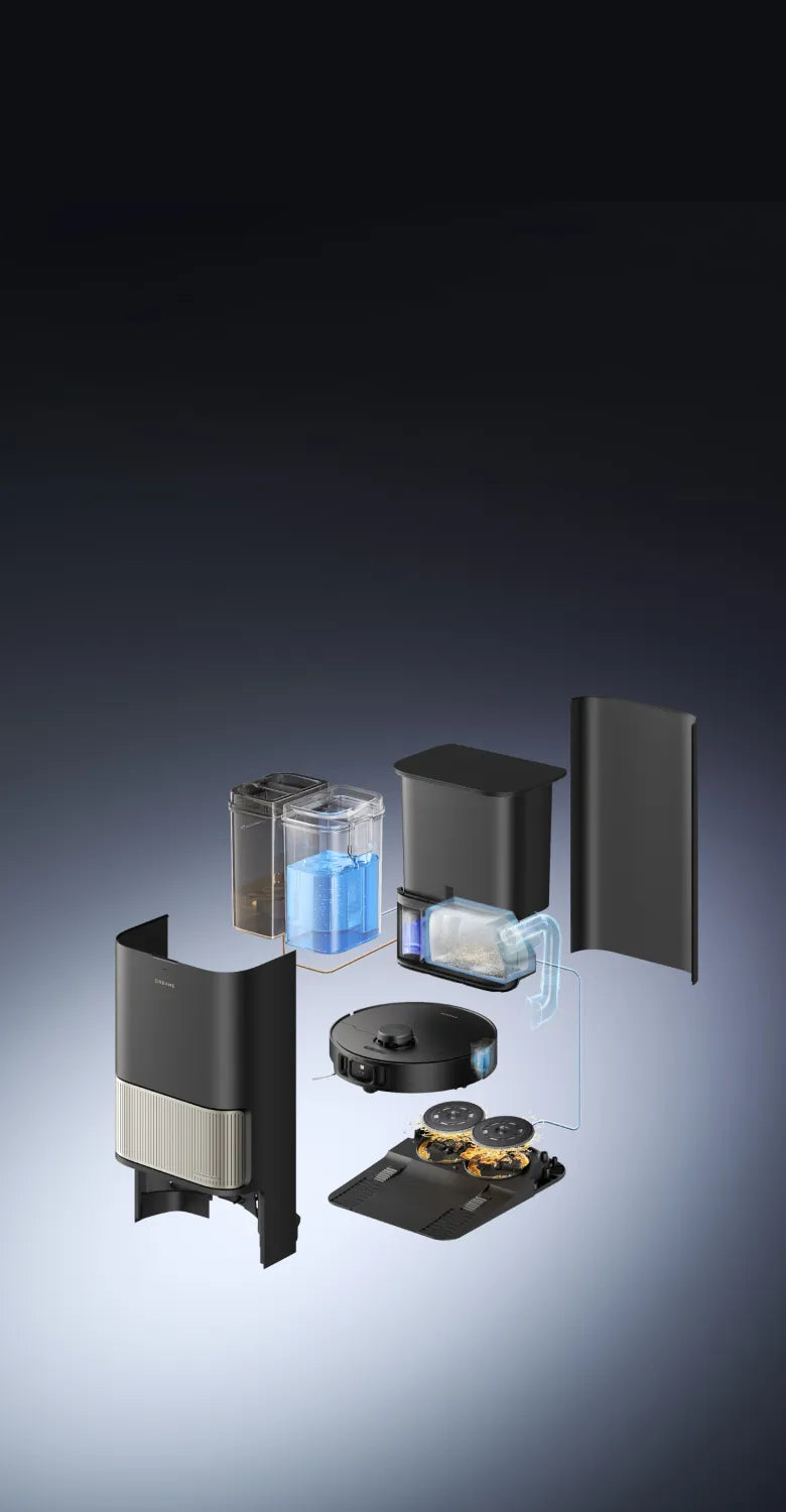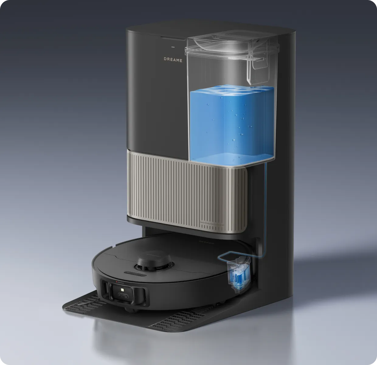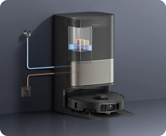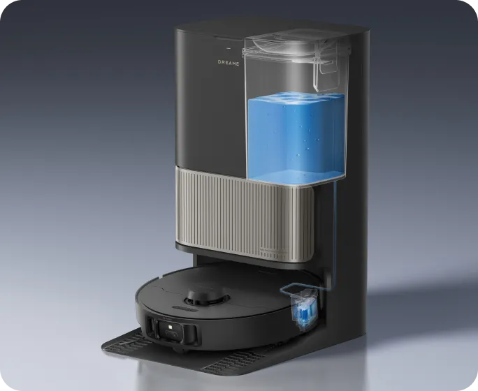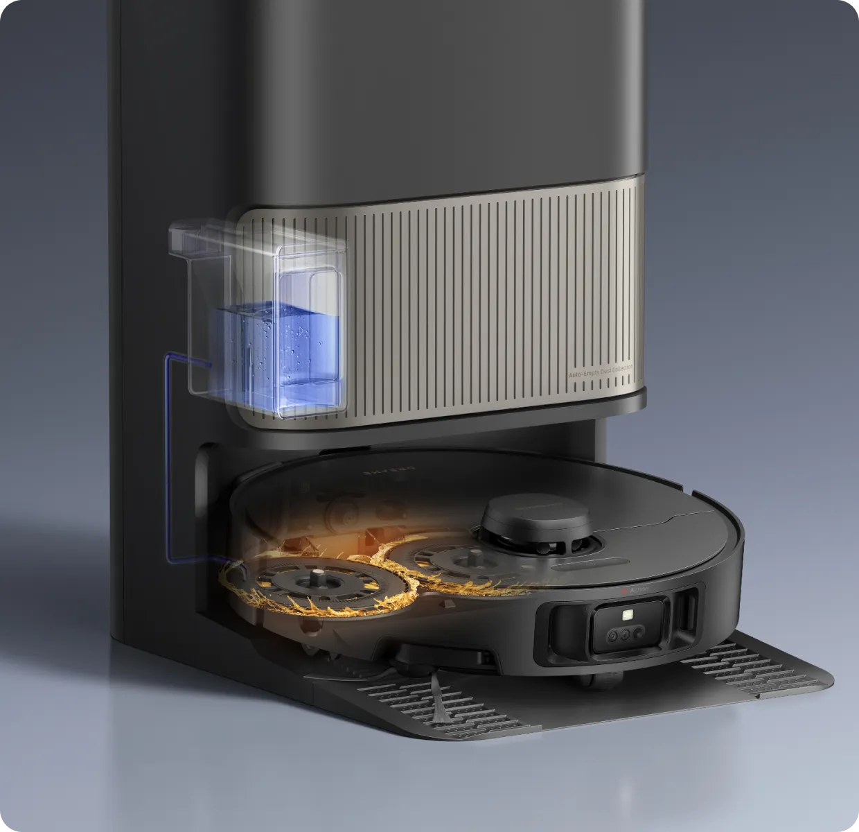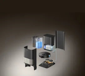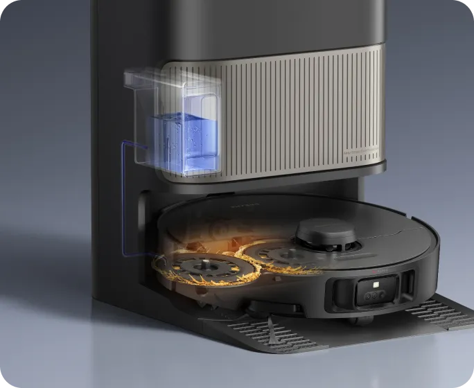 Après le lavage des sols, notre base utilise son capteur de couleur pour évaluer le degré de saleté de l'eau résiduelle. Si elle est trouble, le robot aspirateur relave les serpillières avant le deuxième cycle de nettoyage, afin que vos sols soient toujours lavés avec des serpillières propres.