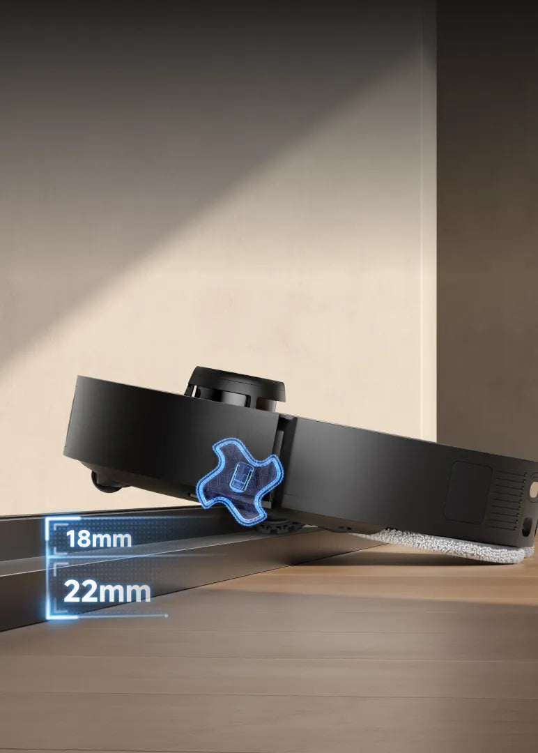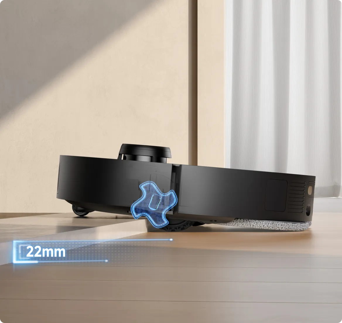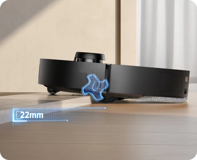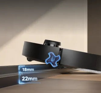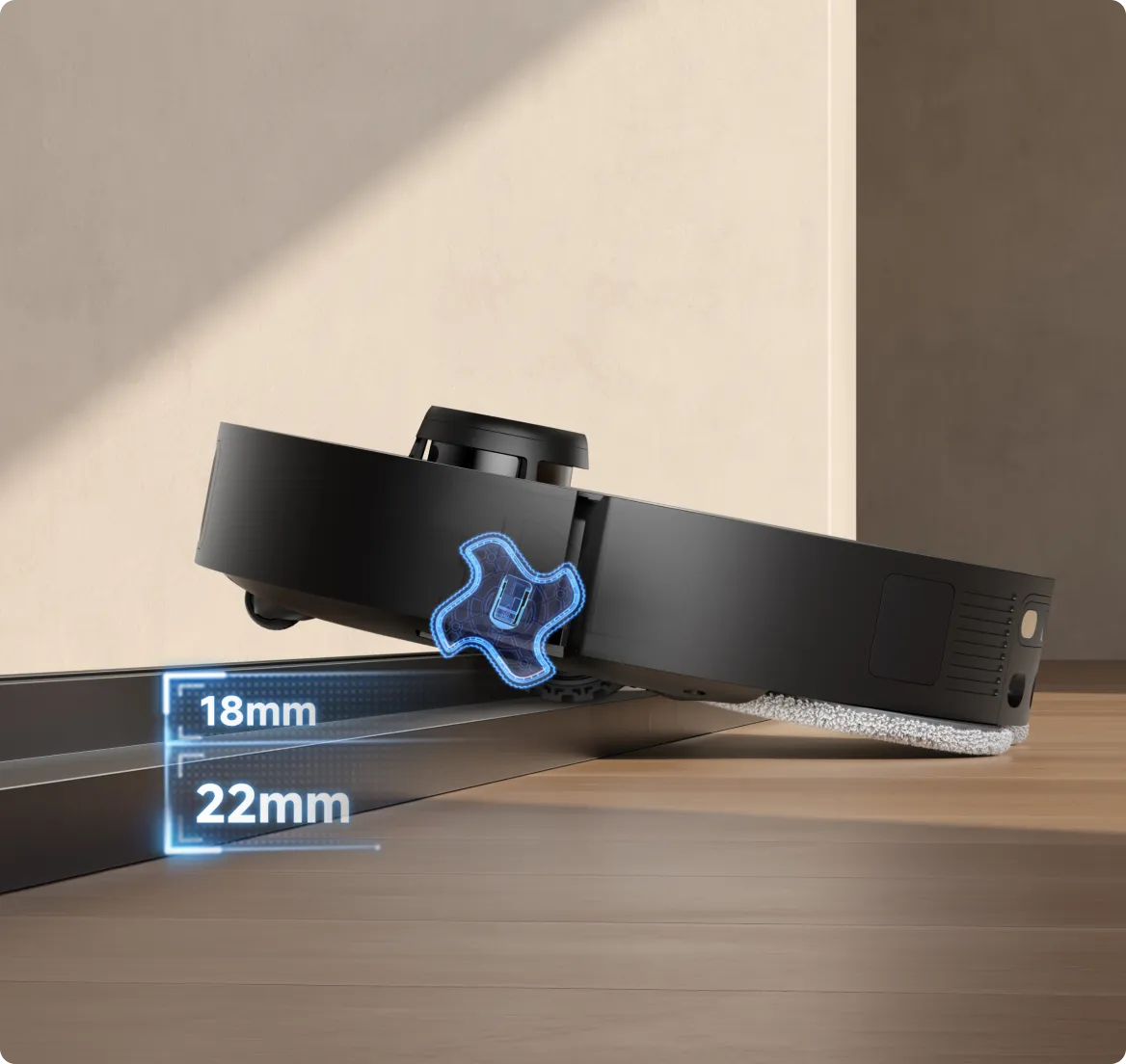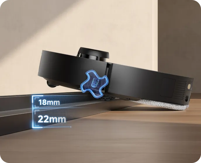 Notre système EasyLeap™ à quatre roues aide le robot aspirateur à monter des marches et à franchir des seuils de porte jusqu'à 40 mm* de haut. Une conception efficace, même sur les sols humides, les surfaces de cuisine glissantes ou les seuils de portes coulissantes.