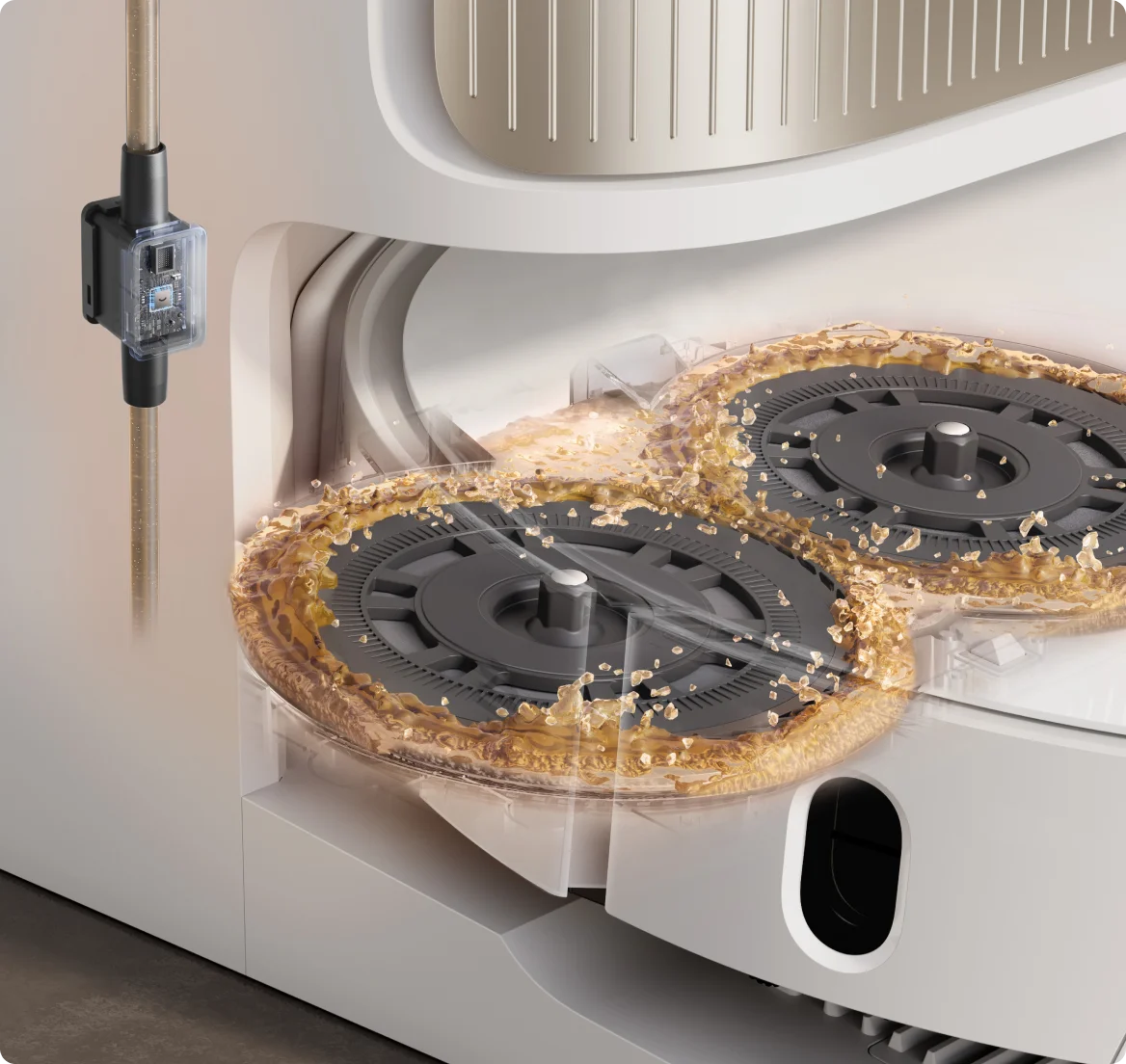 Après le lavage des sols, notre base utilise son capteur de couleur pour évaluer le degré de saleté de l'eau résiduelle. Si elle est trouble, le robot aspirateur relave les serpillières avant le deuxième cycle de nettoyage, afin que vos sols soient toujours lavés avec des serpillières propres.
