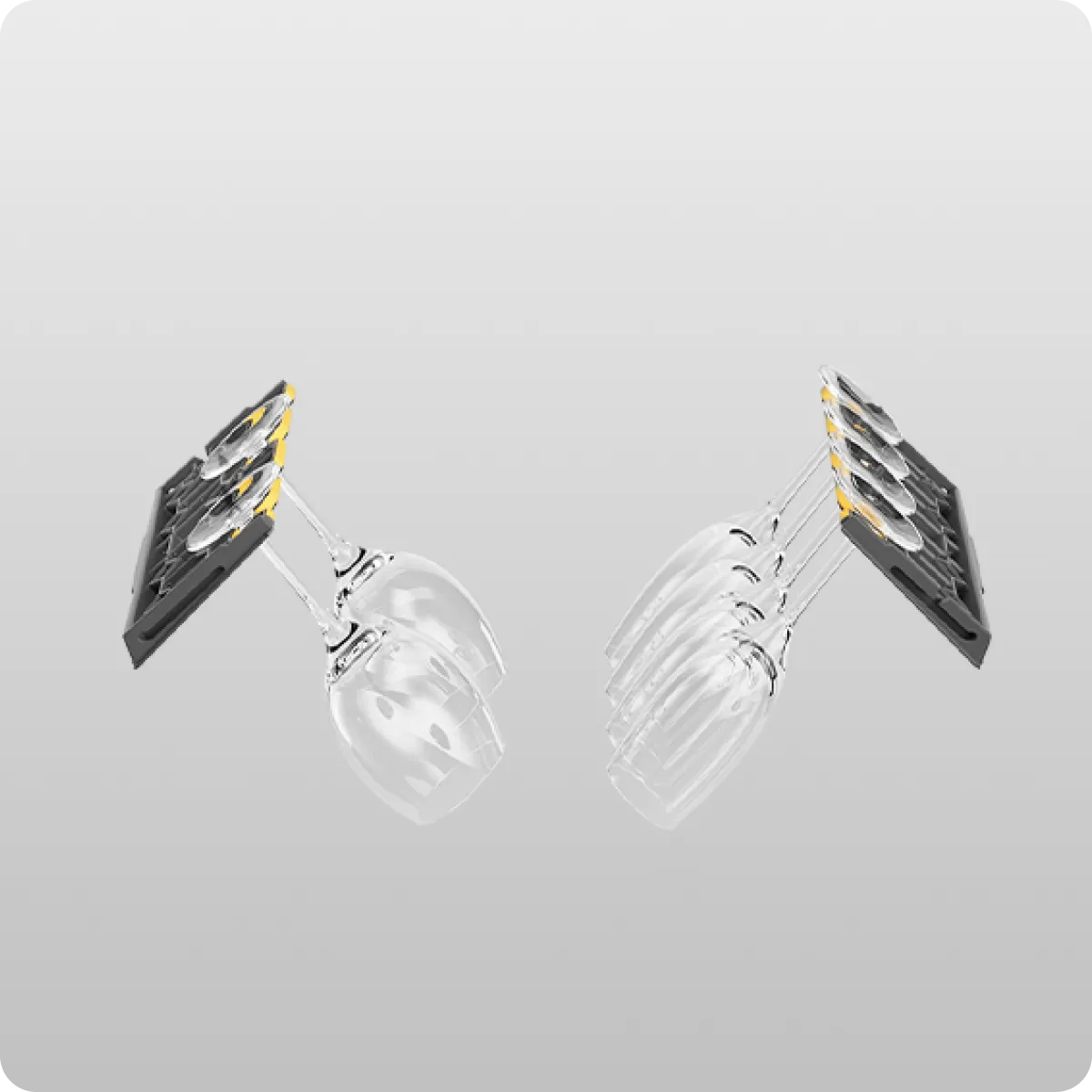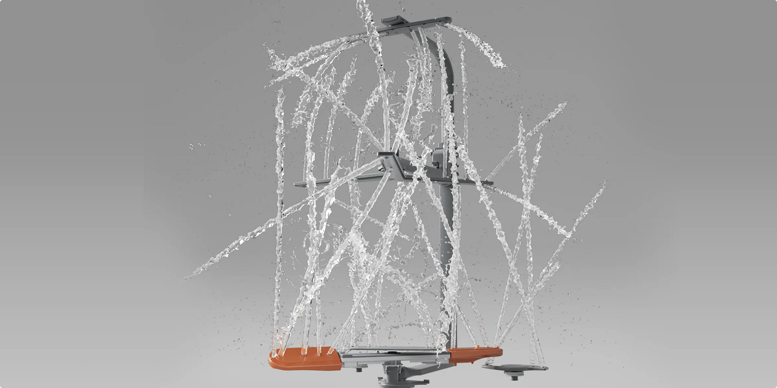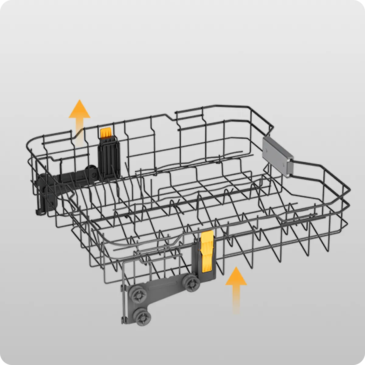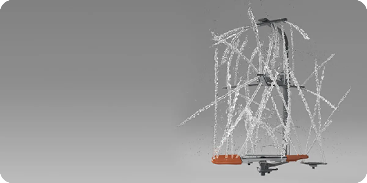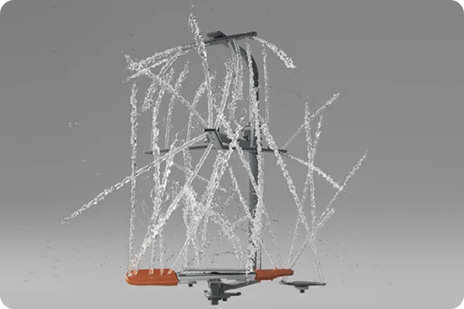 - Le bras FlexWing du niveau inférieur combine deux ailes et une buse rotative : chaque extrémité oscille de 25° pour projeter des jets haute pression, améliorant la couverture de 30 %. Ce système cible directement les deux faces des assiettes pour un lavage puissant et sans résidus.