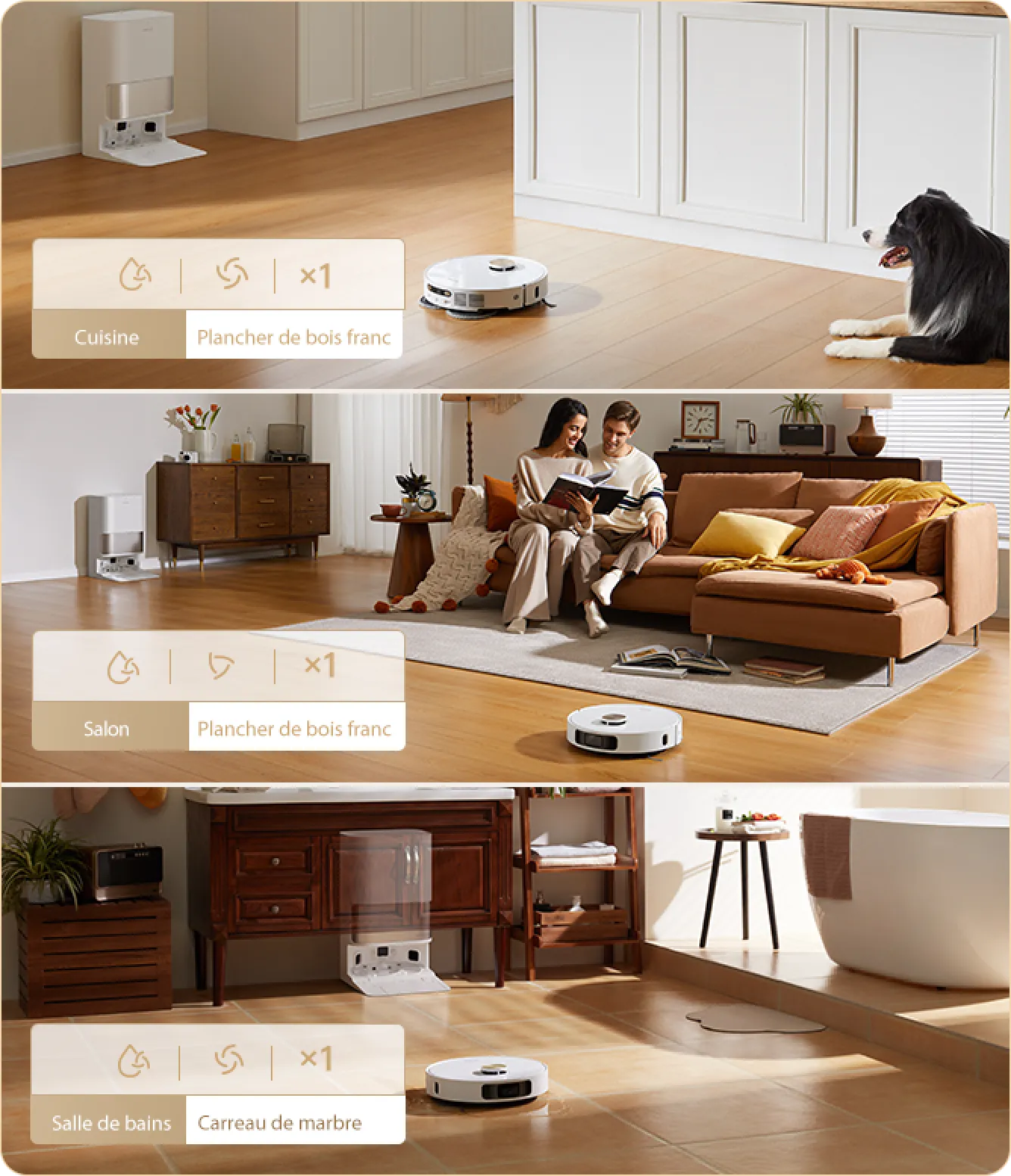 | Aspiration uniquement | Lavage uniquement | Aspiration et lavage | Aspiration puis lavage (levage uniquement pendant le balayage) | Recharge | Nettoyage de moquette | Séchage de serpillière | |