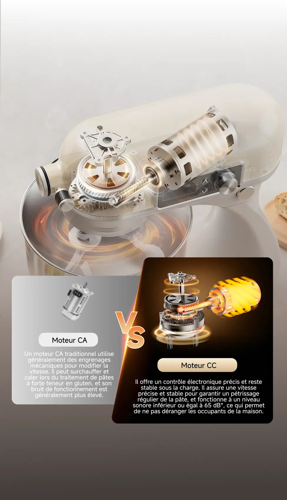 Le moteur à courant continu haute puissance de 800 W traite sans effort les pâtes à forte teneur en gluten avec un minimum de bruit, préservant ainsi la tranquillité de votre maison.