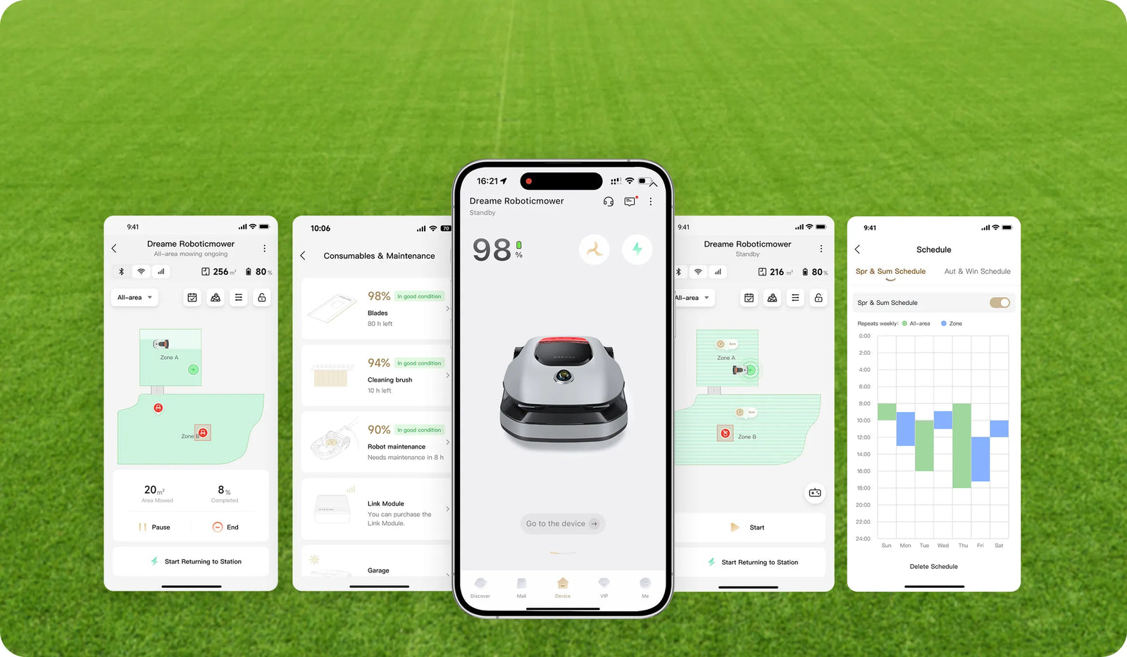 Sur l'application Dreamehome, vous pouvez choisir différents motifs de tonte et créer des conceptions personnalisées, notamment des motifs cœur, carré et bien d'autres, améliorant ainsi l'esthétique et l'attrait artistique de votre pelouse.