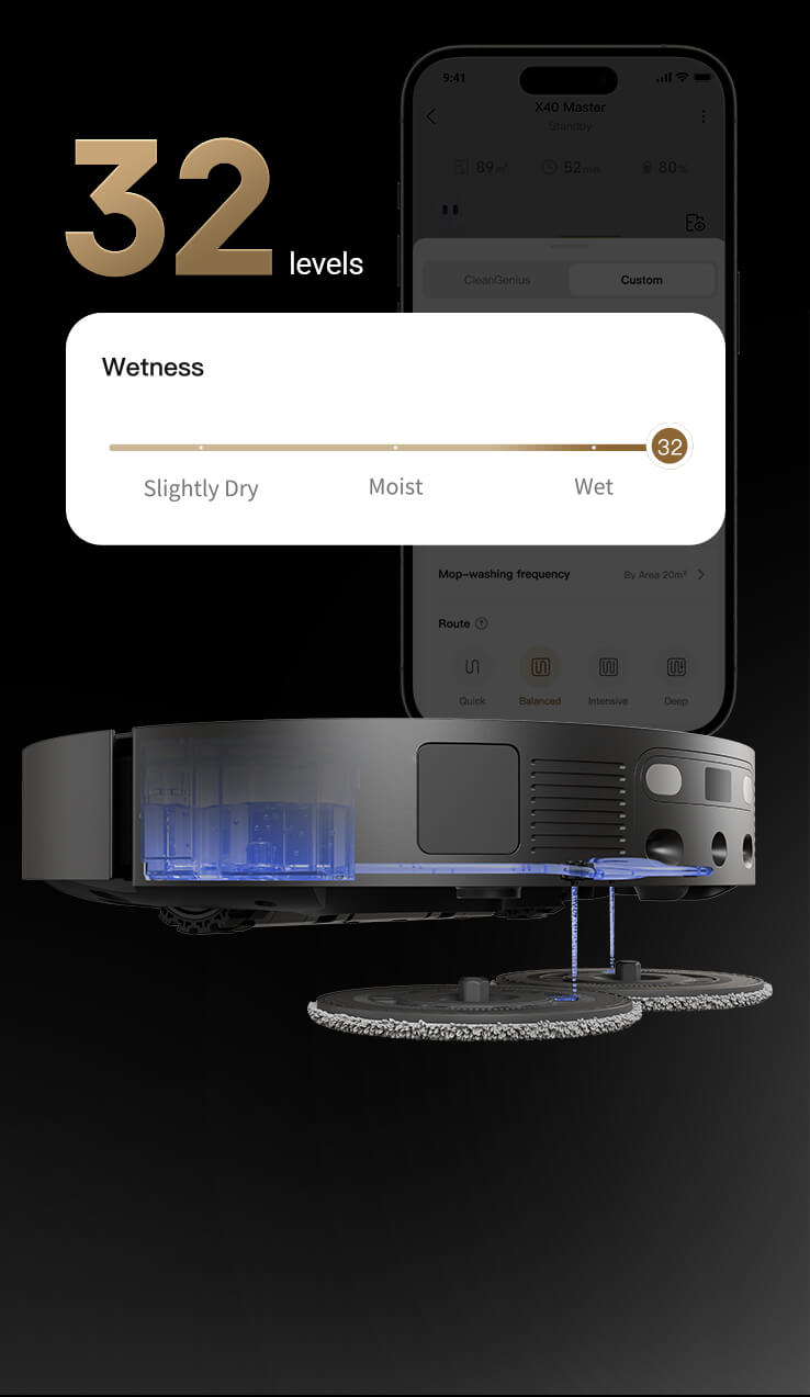 Avec l'application Dreamehome, le mode aspirateur et serpillière vous permet de choisir facilement le degré d'humidité de votre lavage des sols, allant de légèrement humide à bien trempé. Après le passage de la serpillière, un capteur de couleur analyse la saleté de l'eau et adapte automatiquement la quantité d'eau utilisée (sur 32 niveaux), particulièrement pour les endroits très sales.