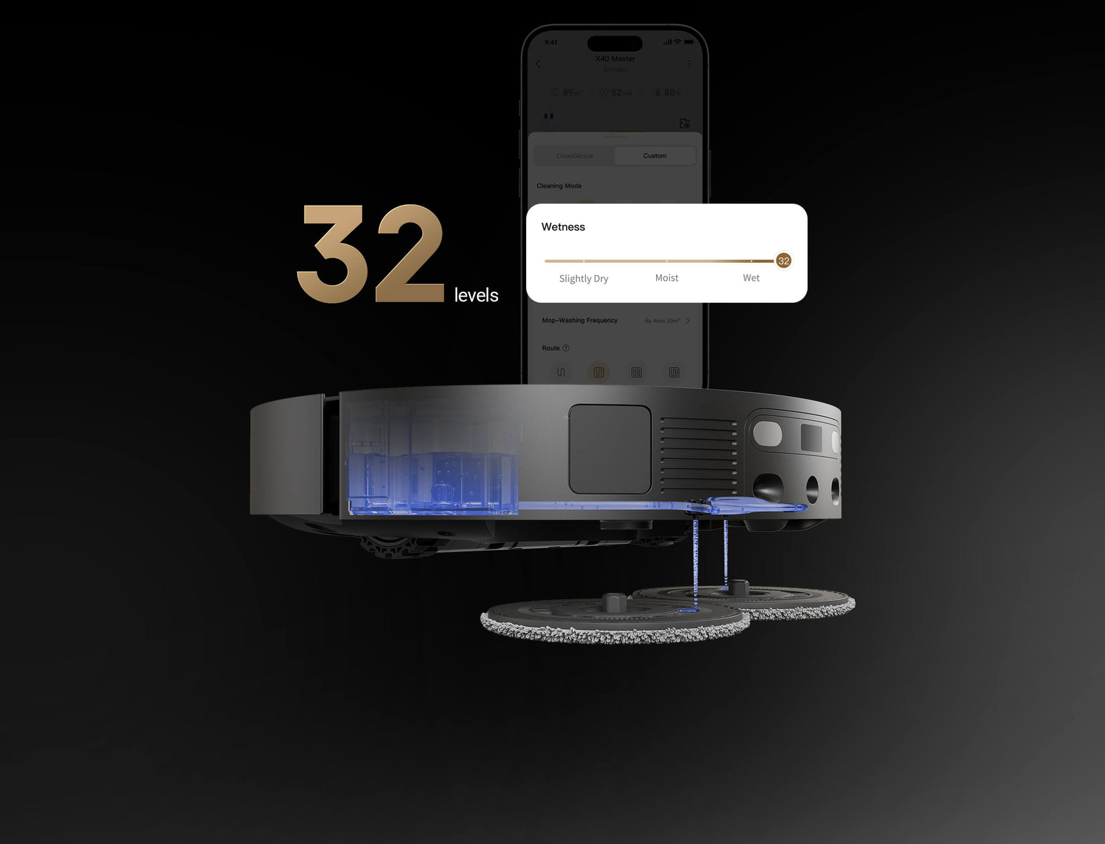 Grâce au levage automatique des serpillières, le X40 Master évite d'humidifier les tapis et moquettes pendant le nettoyage. Cette fonction vous permet de personnaliser votre routine de nettoyage, améliorant ainsi la polyvalence et le confort d'utilisation de votre appareil.