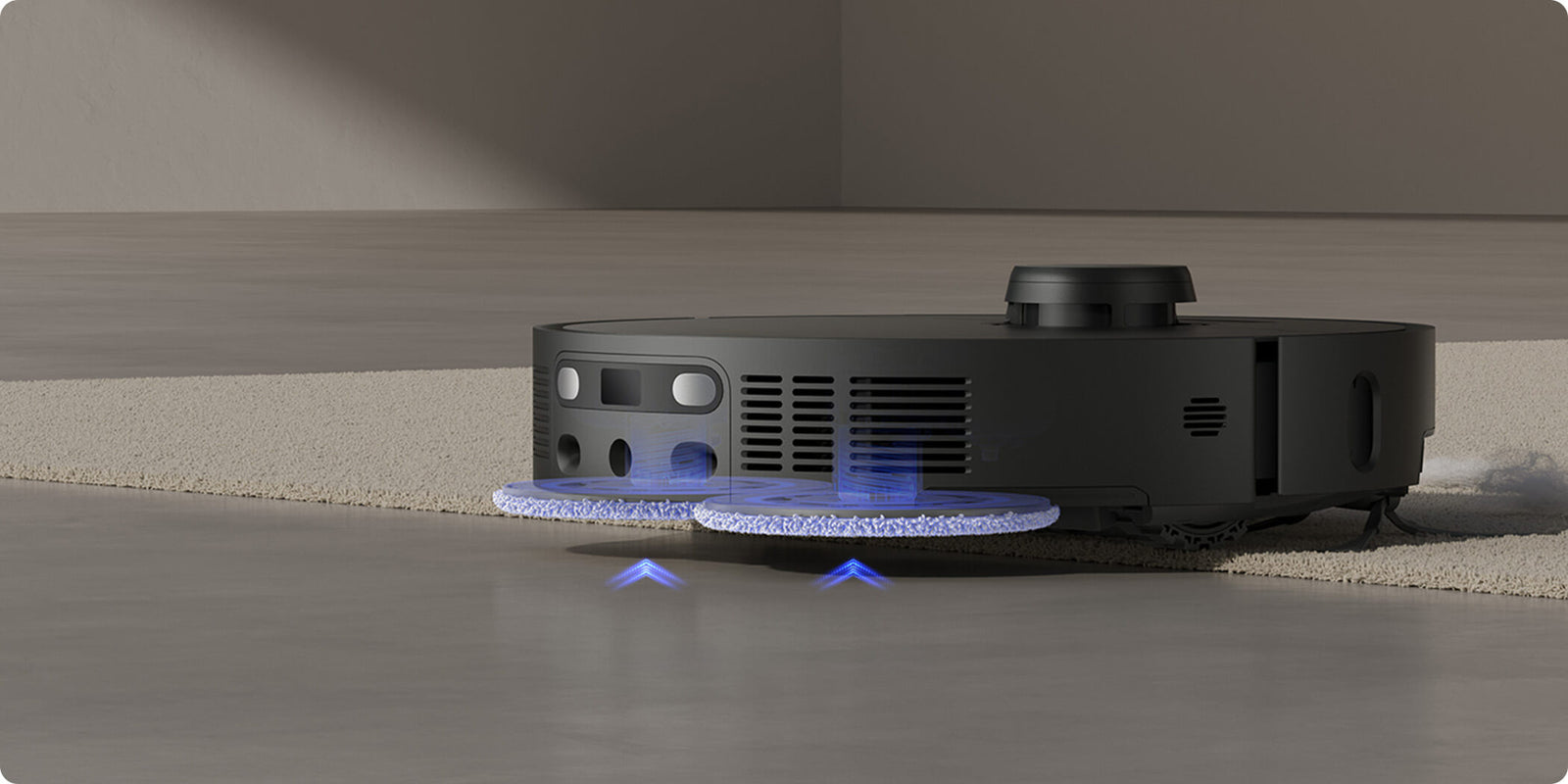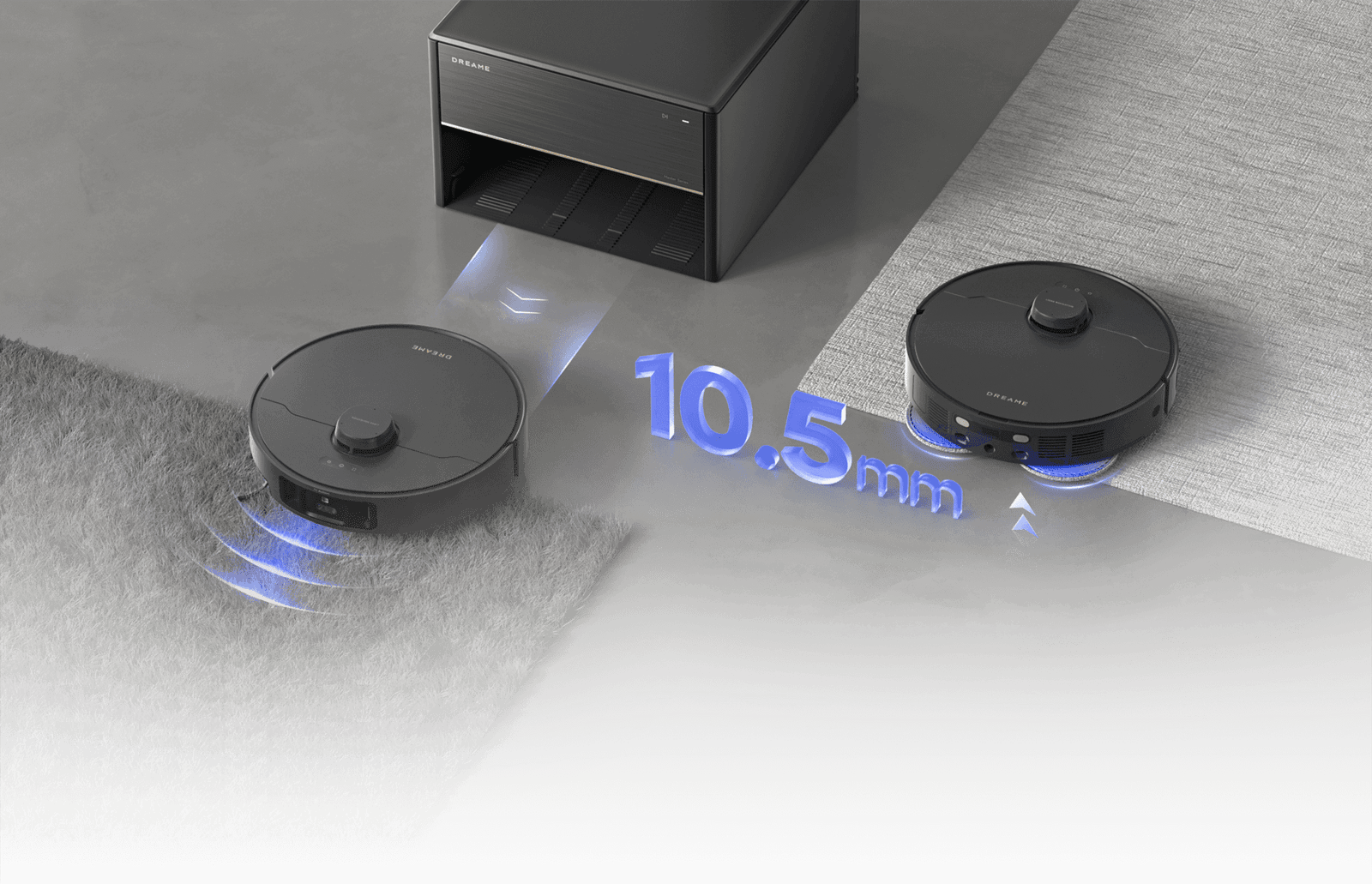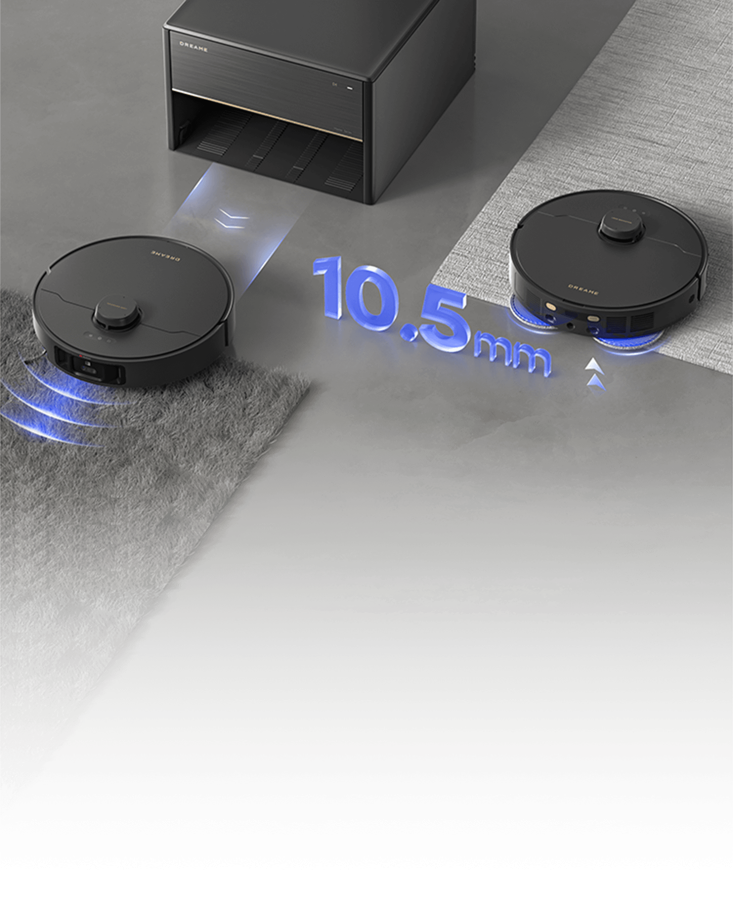 10,5 mm : différence de hauteur du robot aspirateur de 10,5 mm avant et après le levage de la serpillière. Pour les tapis et moquettes ayant des poils de plus de 5 mm, nous recommandons d'utiliser l'application Dreamehome pour programmer votre robot aspirateur afin d'éviter les tapis et moquettes à poil long et de les préserver de l'humidité.