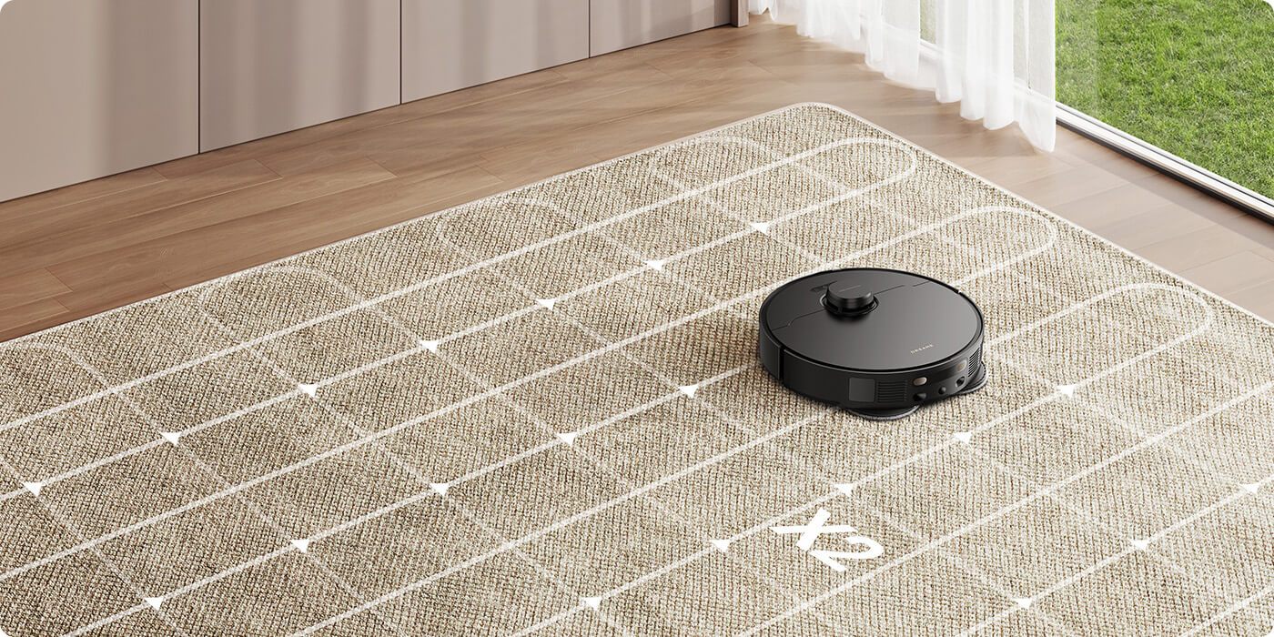 Activez le mode nettoyage intensif des tapis/moquettes* et laissez le robot effectuer un double passage méthodique à vitesse réduite, assurant un nettoyage en profondeur qui préserve la beauté de vos tapis et moquettes.