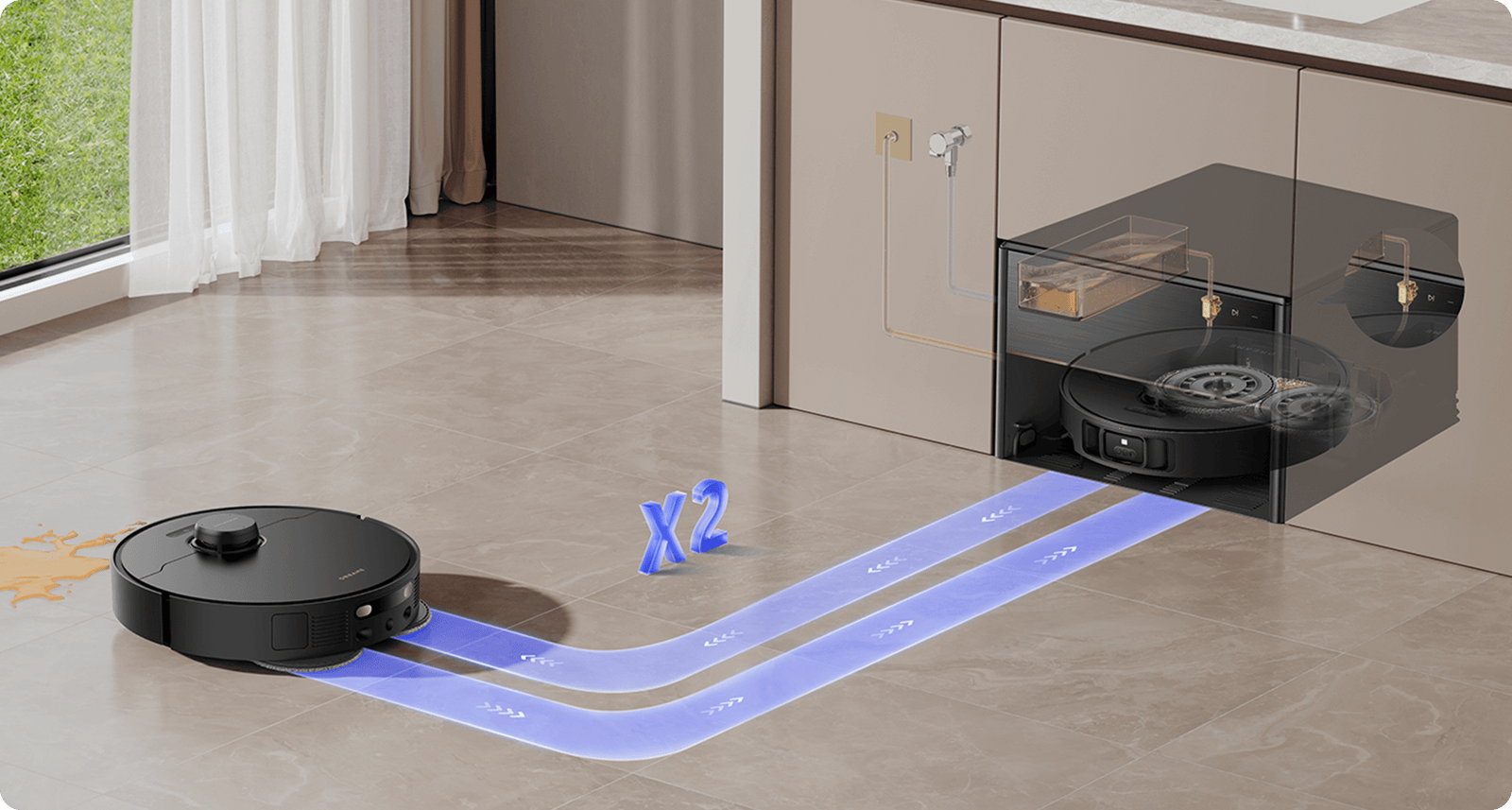 * 308 m² : tests réalisés dans le laboratoire de Dreame en mode lavage avec des réglages d'aspiration silencieux. Les performances réelles dépendent de l'environnement domestique.