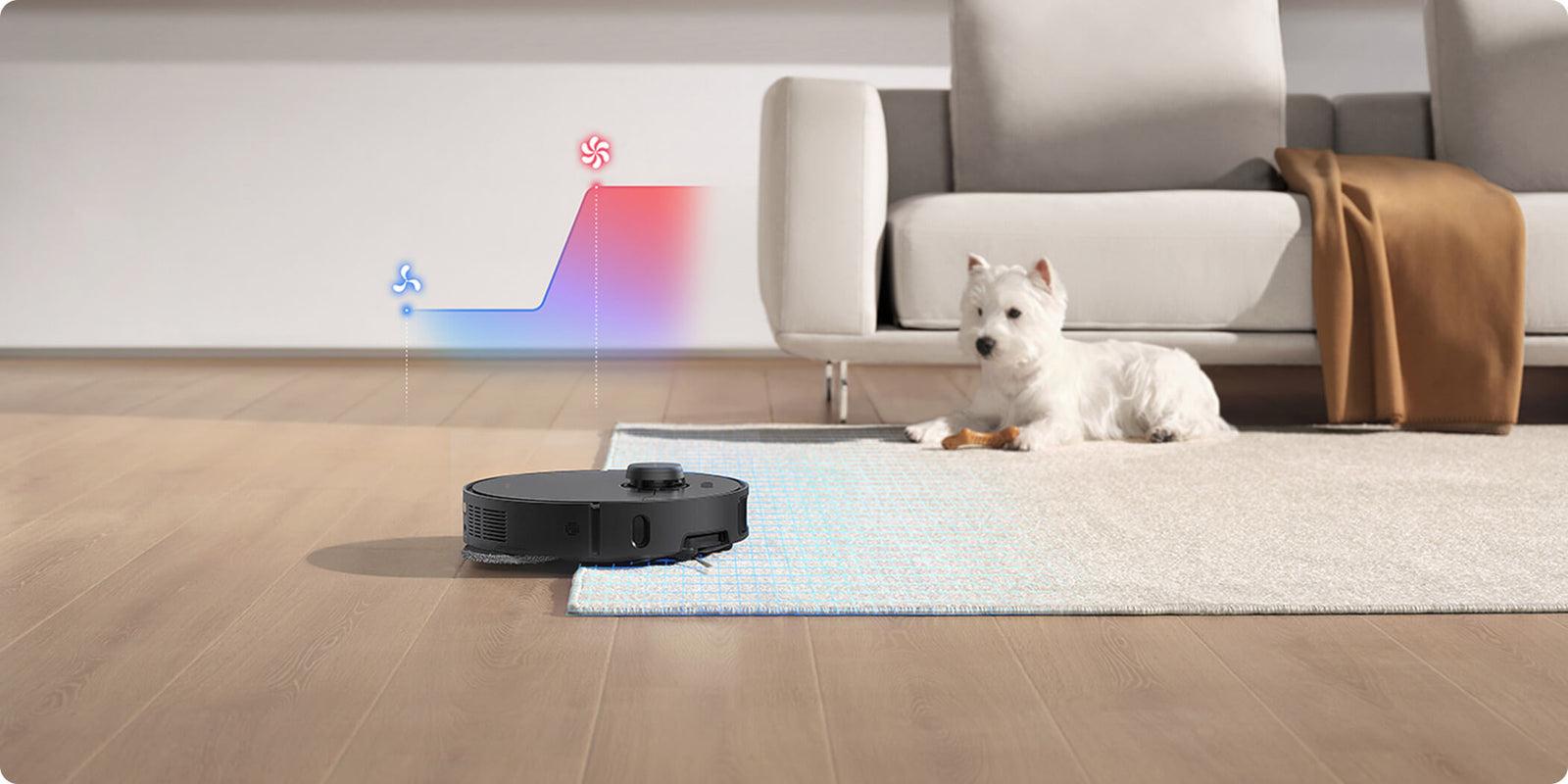 Fonction d'aspiration optimisée : ce mode est accessible via l'application Dreamehome. Dès que le robot détecte un tapis ou une moquette, il active la puissance d'aspiration maximale. Notez que cette fonction n'est pas disponible en mode d'aspiration silencieux.